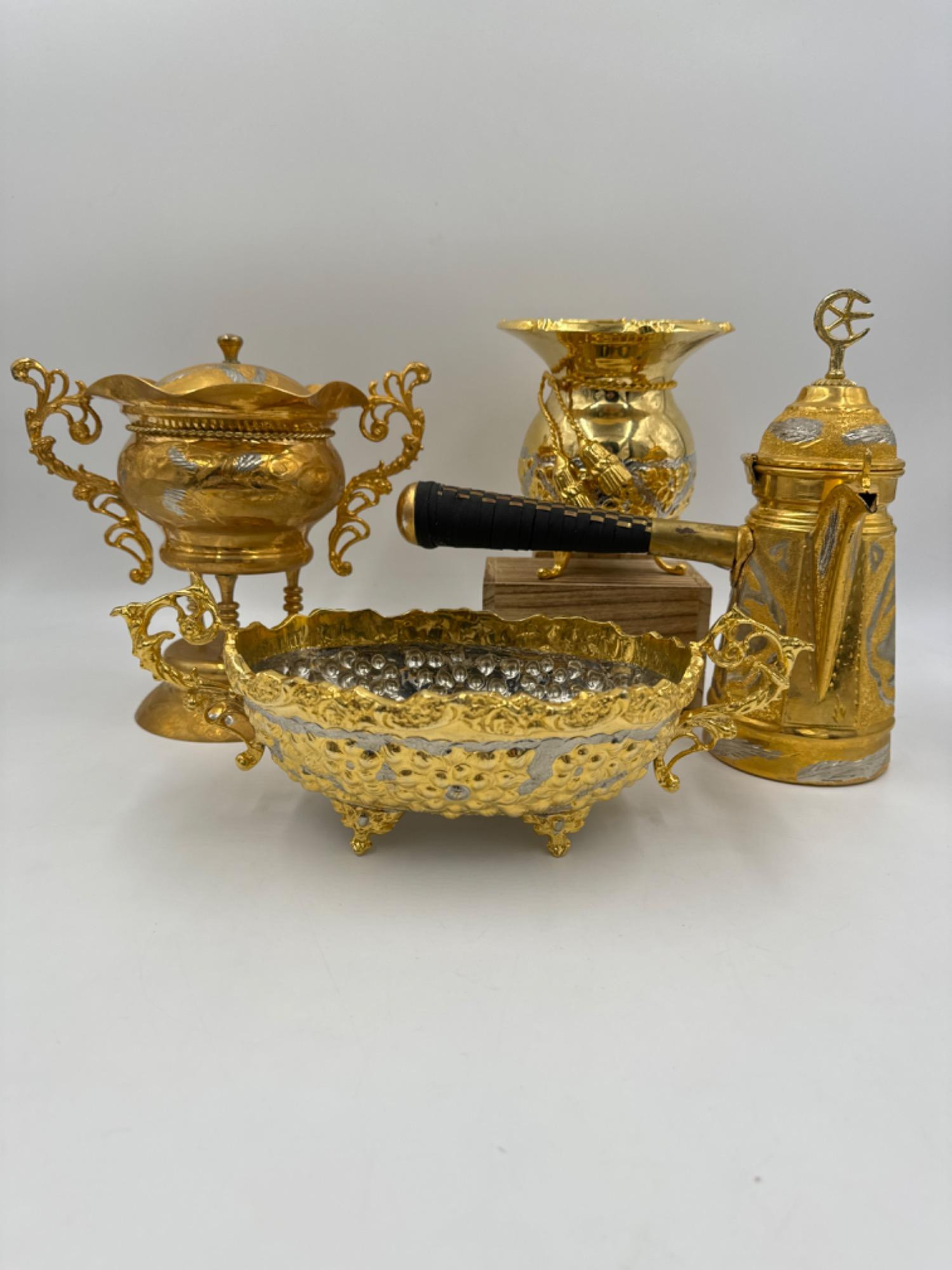 Ornate Gold Tone Decor - Turkish Coffee Pot, Silvana Gold Plated Duo Tallest measures approximately 9.25"T Widest measures 11.25"W Turkish coffee pot with matching lidded vessel Two are Silvana gold plated handmade items All items have wear to the gold finish but in general good condition.