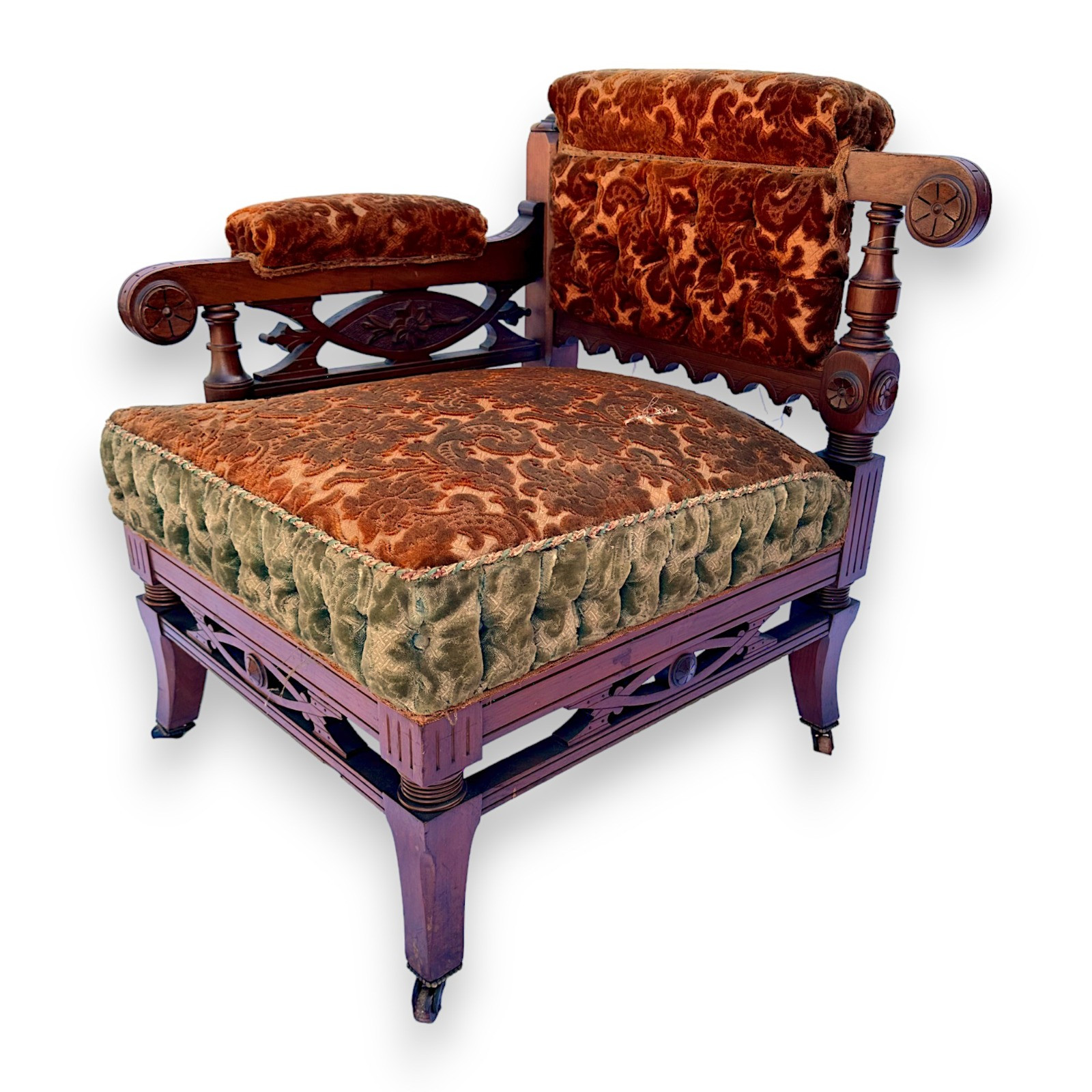 Antique Victorian Eastlake Bustle Chair w/Damask Upholstery Floral detail carved into wood portions. Measures: 26"W x 27"D x 31"T x 17" seat height 3 inch tear on seat top upholstery Wear from use and age on the wood around the feet and base.