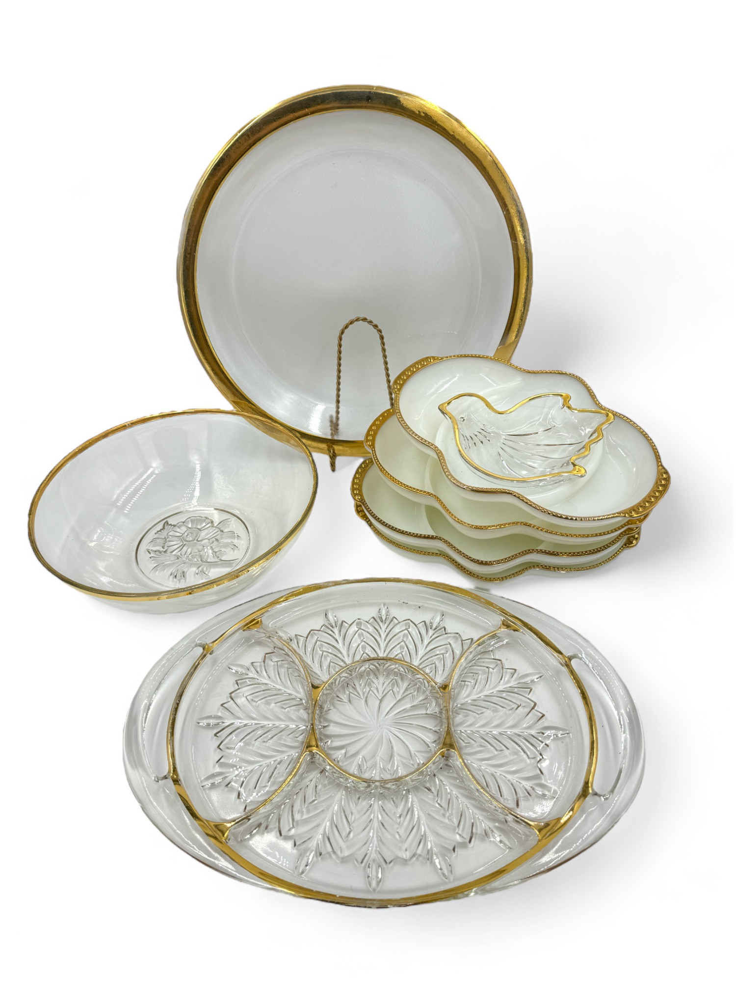 A Touch of Gold - Clear & Milk Glass w/ Gold Details Some wear to gold. 14.75”D 16”L tray 10.5”D bowl (4) 11.25”L milk glass Fire King