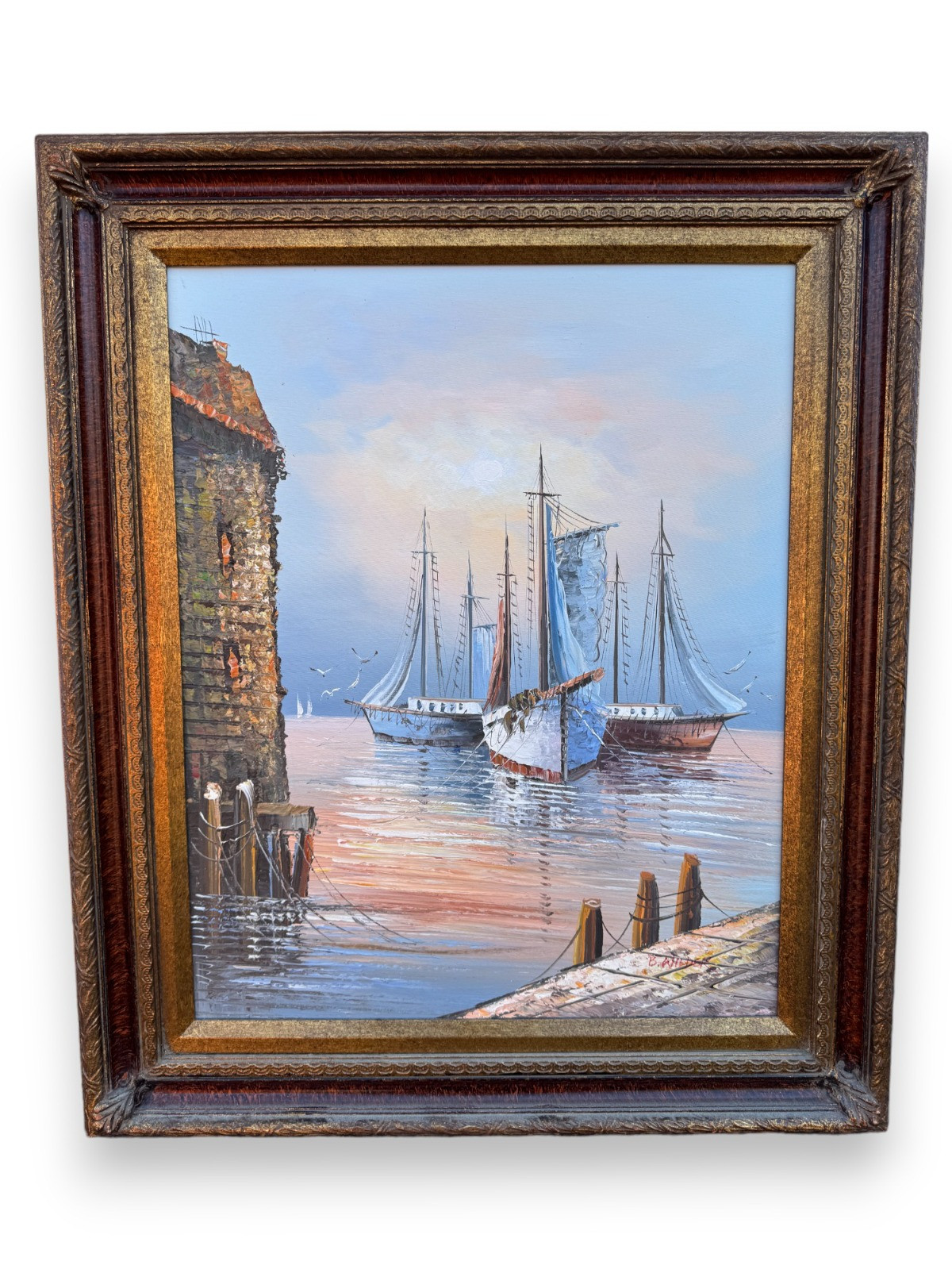 Original B. Wilder Sailboats in Harbor Painting Frame measures: 21.5 x 25.5" Signed B. Wilder - oil(?) on canvas Excellent condition