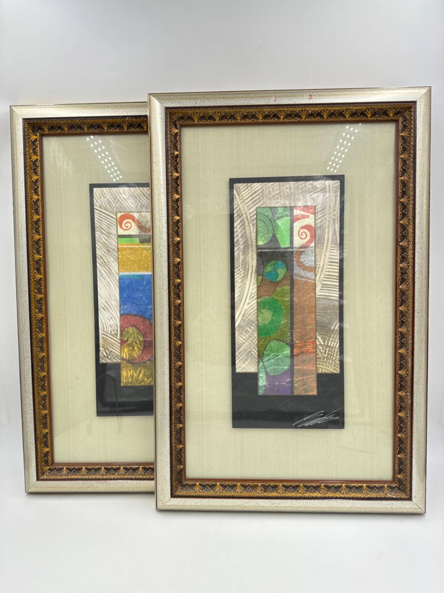Signed and numbered Multimedia Postmodern 'New Italian' Art Pair by Butler 38 out of 375, Signed Frames measure: 23.5 x 15.25" Damage to one of the frames