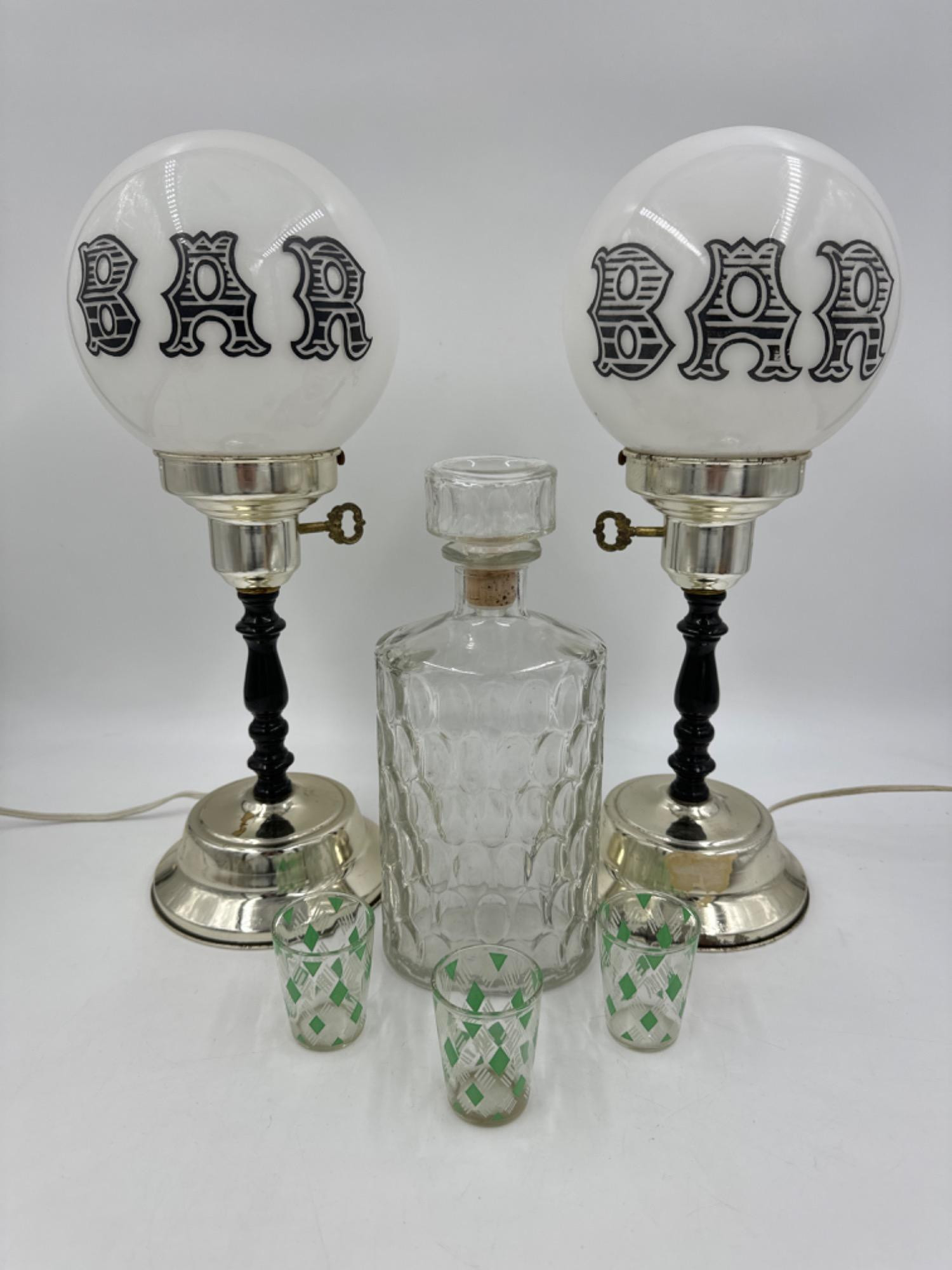 Mid Century Globe BAR Lamps + Decanter & Shot Glasses Bar lamps both work - one of the bases is losing its metallic tone, general wear to bases - 15"T - Works! Vintage glass decanter and three shot glasses. Everything needs to be cleaned.