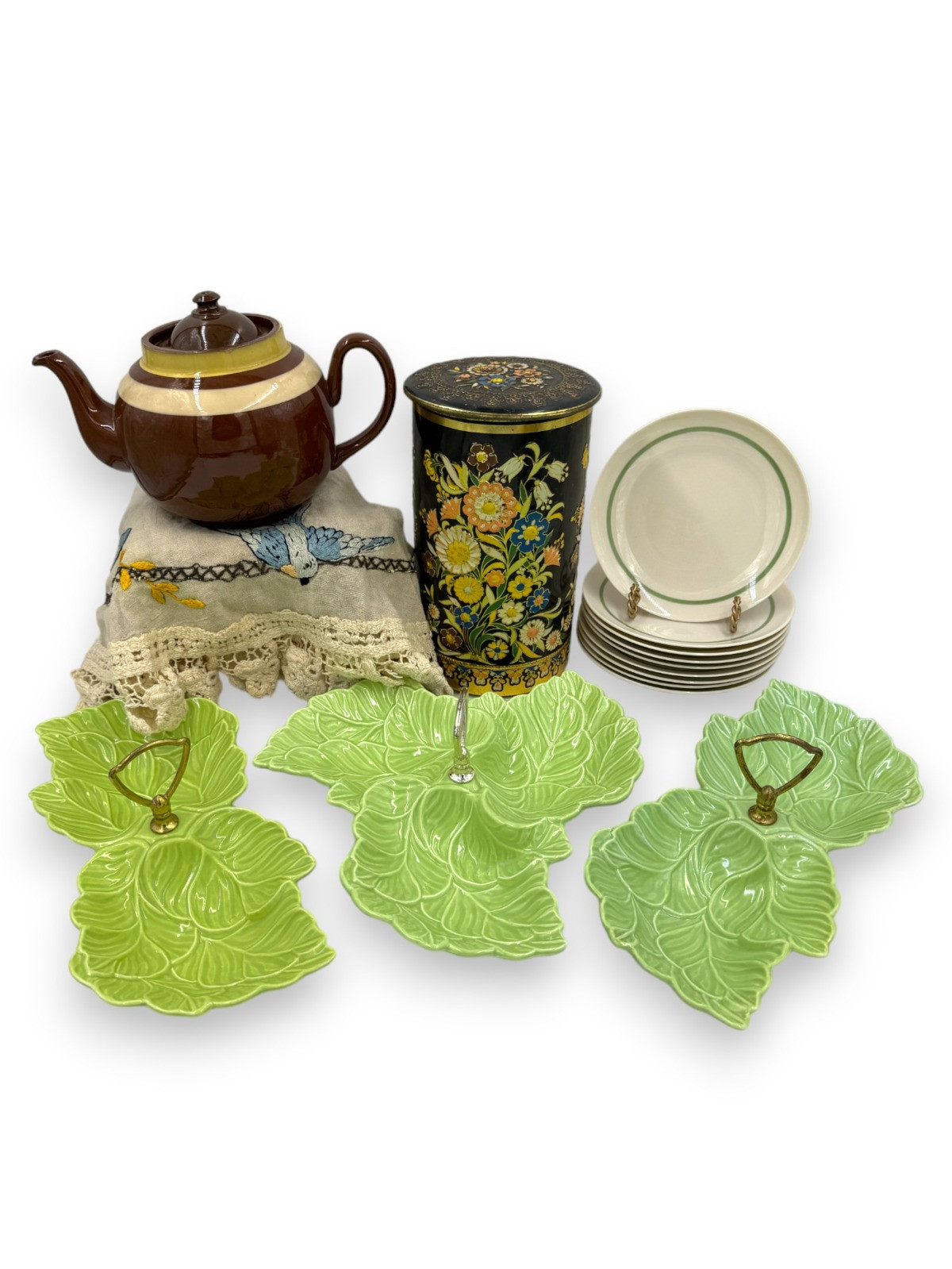 ALB Alcock Lindley Bloore Teapot in great condition! 7"T x 10"W Danish floral biscuit tin Matching California pottery cabbage trays - (2) 11" 73 12.5" 72 two with a cooler blue green and one with a yellow green (9) Franciscan China Westwood 7"D