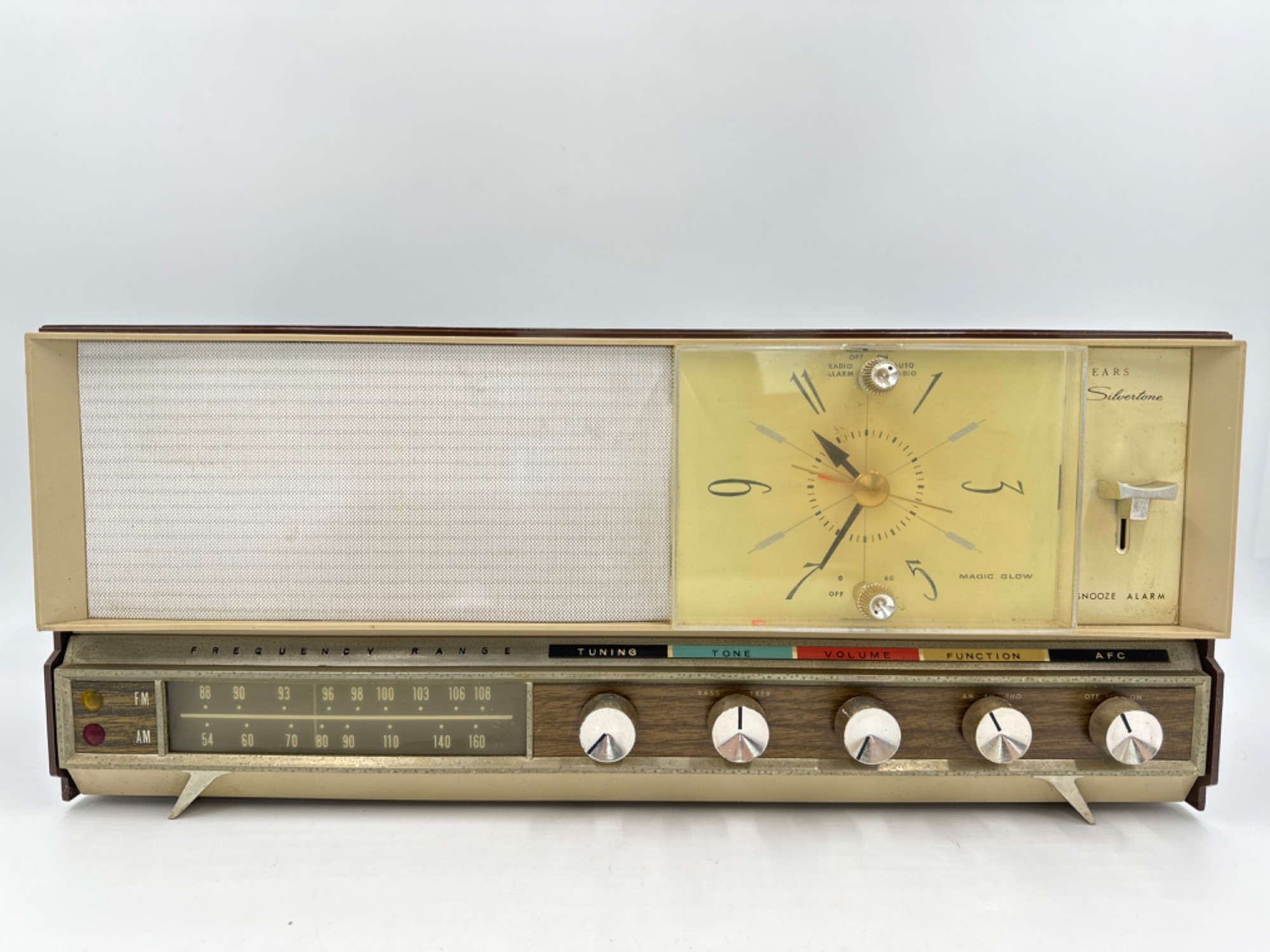 Mid Century Sears Silvertone Retro Alarm Clock Powers on and speakers work. Hard time getting FM, but AM works. Unsure if any other parts work Measures 16.75"L x 5.25“D x 7"T Exterior faux wood has rubbed away and some spots need a good cleaning