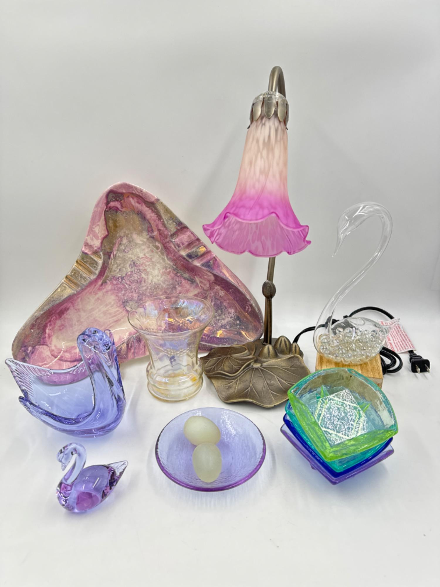 Santa Anita "Mist" CA pottery ashtray - 14.5”W - great condition Purple Art Glass Swans - 6.25”T & 3.25”T 8” Hollow blown glass swan Pink Pond Lily lamp appears new/unused Fire & Light Handmade Recycled Glassware trays
