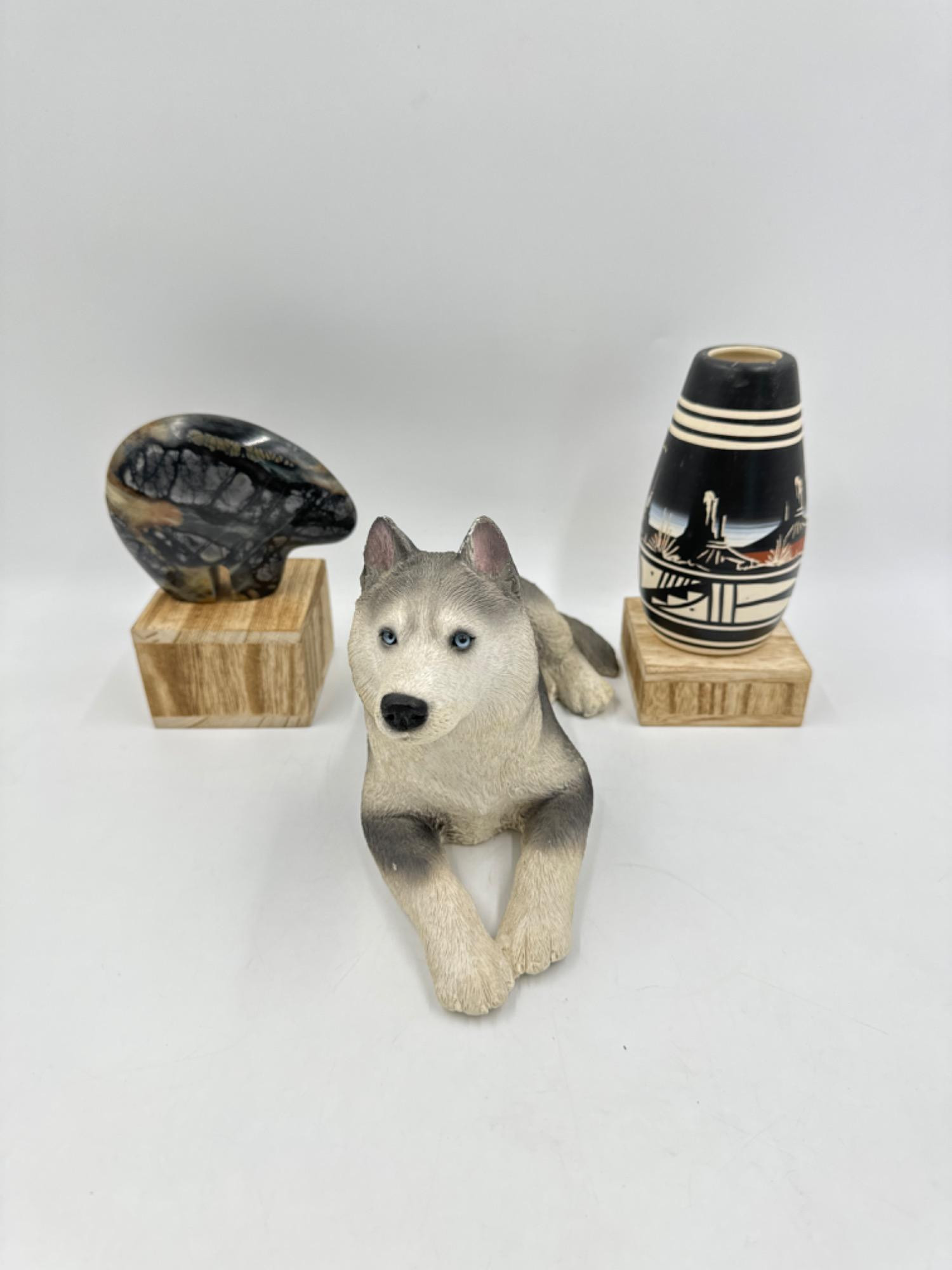5.5"T Signed "Navajo" vase 3.75"T Polished carved stone bear 1986 Livingstone husky - 11.5"L x 6"T - has some wear