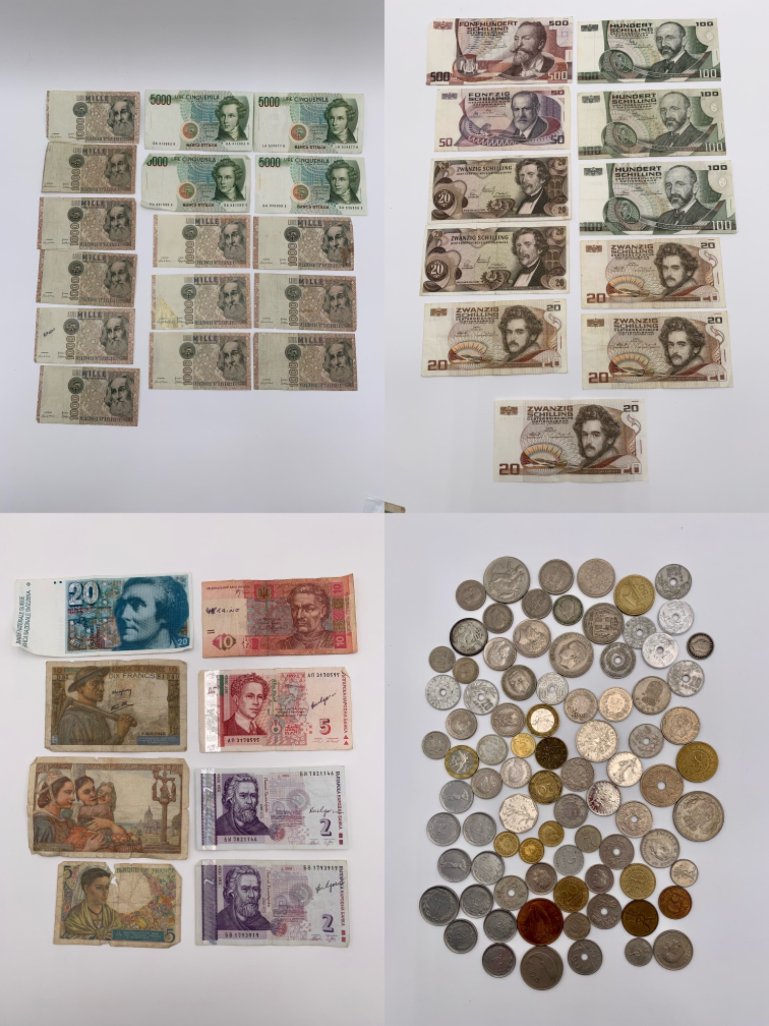 Vintage coins/paper currency from the following countries: Italy, France, Austria, Switzerland, Ukraine, Bulgaria, Denmark, Ireland, Turkey, and Greece (pre-euro for many of these countries).