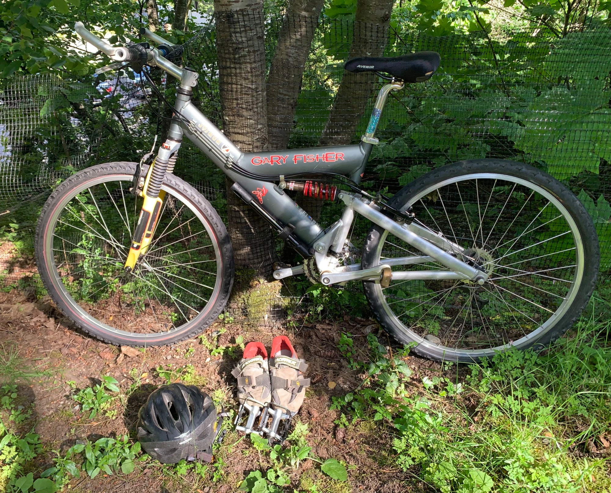 This was one of Gary Fisher's most loved or hated models - it seems no one is neutral on this one! Our client loved it and rode it on a month-long tour to India when it was new and intermittently since then. This model is hard to find nowadays and many consider it a classic design if a bit quirky. In matte grey finish with a heat-treated aluminum main-frame and lots of bells and whistles including full-suspension. Has Rock Shox, Real braking system, Avennir seat, hybrid street/mountain Panaracer tires, quick-off wheels, and the original pedal pads that were removed for clip bike shoe use. Note, while there are a few scratches and a small rip in the seat (see last photo), the bike is in overall great condition. It was given a tune-up a year ago by Rat City Bikes in White Center and just needs its tires to be inflated. Measures 26.5" floor to crossbar & 37.5" floor to handlebar. Wheels are 26" diameter. Also included is a Bell helmet, bike pump, and size 8 women's bike shoes. LOCAL PICKUP ONLY ON THESE ITEMS