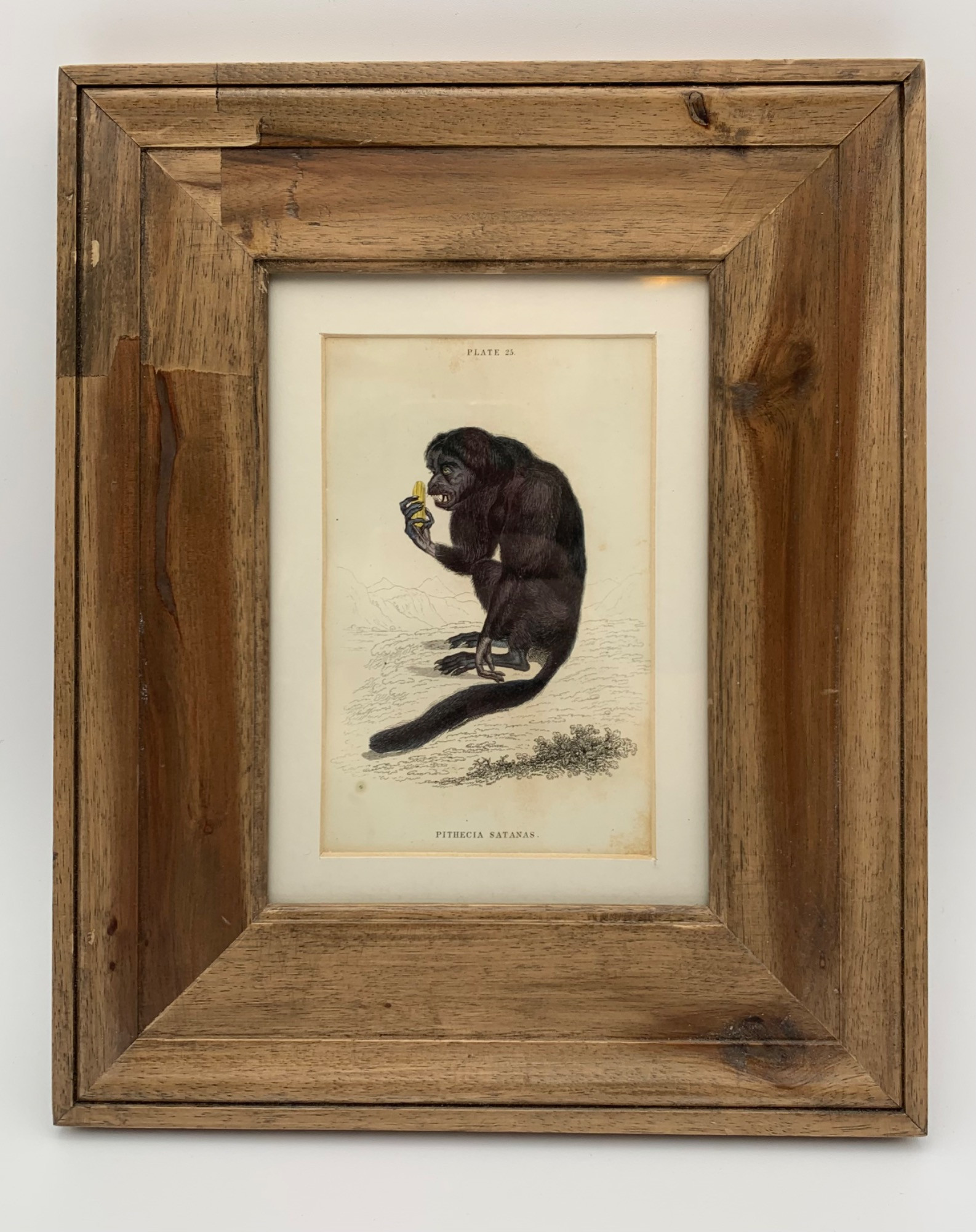 This is a vintage book image from the 1800s. We believe it is from "Natural History of Monkeys" by William Lazar (1788-1859), published in Edinburgh in 1833. The illustration is of Pithecus Satanus (Pithecis Satanas) - the black bearded saki monkey - enjoying a snack. Love the detail - the bony fingers and rat-like feet are terrific! Great detail typical of etched bookplates of the period. Some yellowing along edges due to age, but a terrific anthropomorphic character study! Grained wood frame. Measures shy 11" H x shy 9" W x .75' D framed.