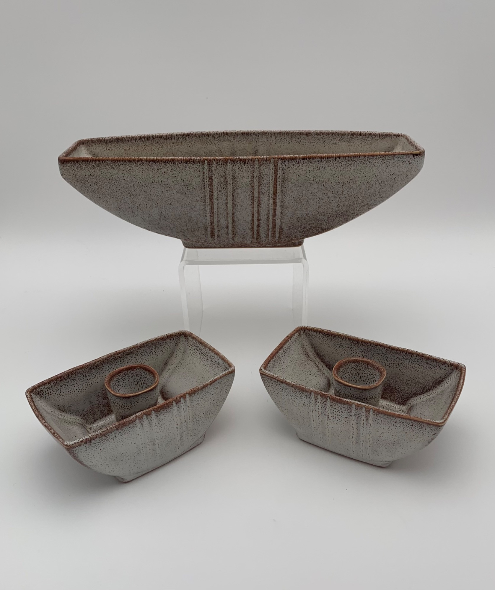 Wonderful off-white and brown flecked trio of ceramic pieces from Stanley Ballard of Vermont. Perfect example of MCM aesthetic with curves & and a hint of Art Deco in the "step-back" center decoration. Two candleholders & a centerpiece tray for low floating flowers or candy/nuts. In impeccable condition with no flaws noted. Tray measures 3" H x 10.5" W x 3.5" D. Candleholders measure 2" H x 5" W x 3" D.