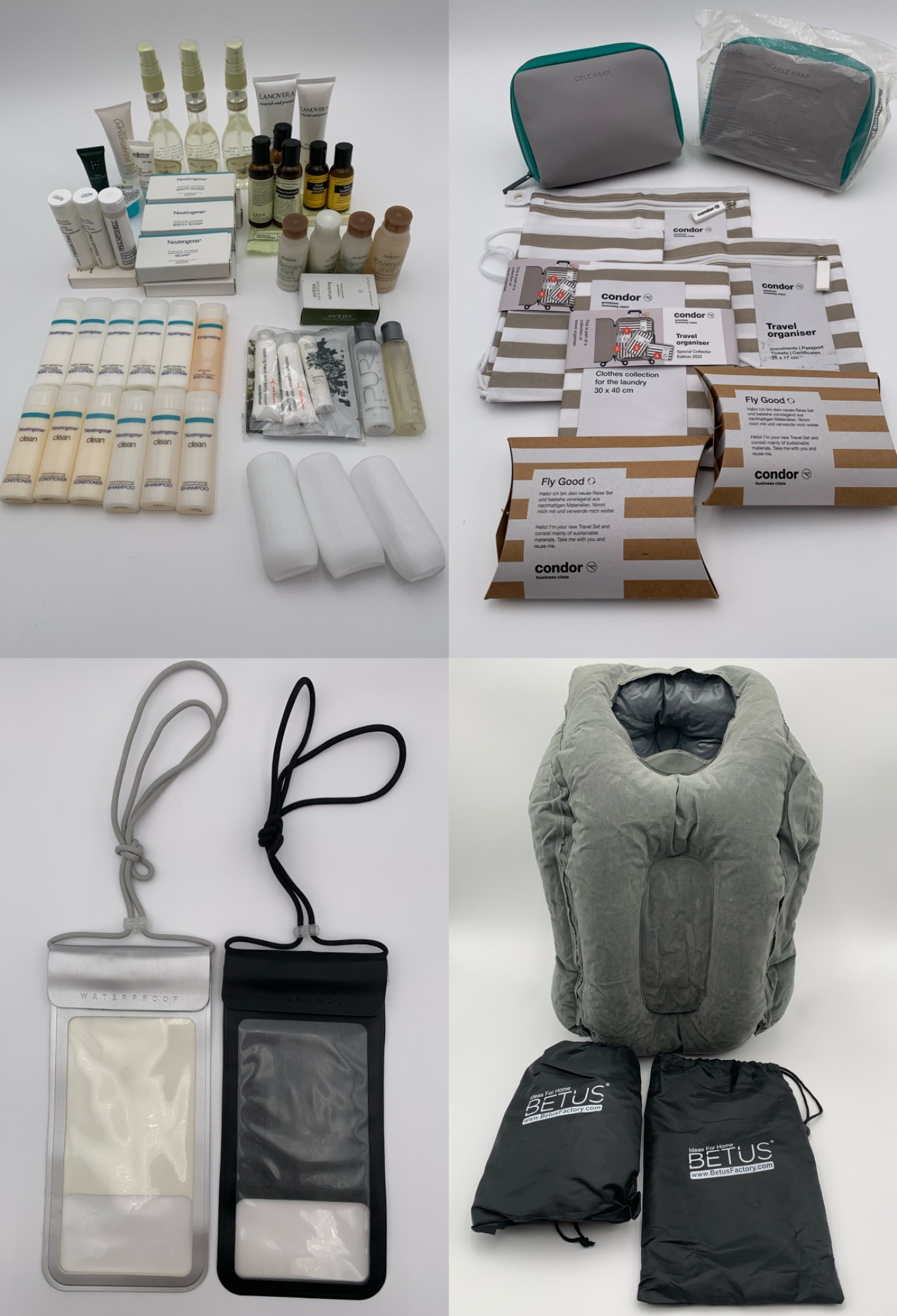 Items that make travel easier when trying to sleep, feel fresh, or keep your papers safe. Lots includes: Lots of perfect size miniatures from Neutrogena, Paul Mitchell, Aveda, and others. 2 waterproof neck-hung passport/cash pouches - prevents pickpockets and keep your hands free. 2 inflatable "comfort pillows" for the long plane ride. Blow them up (they have a double plug so you don't accidently deflate them) set them on your lap or your tray table, insert your hands/face and have lots of support without getting a neck or backache. Come with storage bags. Business class/Premium Economy kits from Condor & American Airlines for long-haul flights with creams, toothbrushes, socks, eye masks, etc.