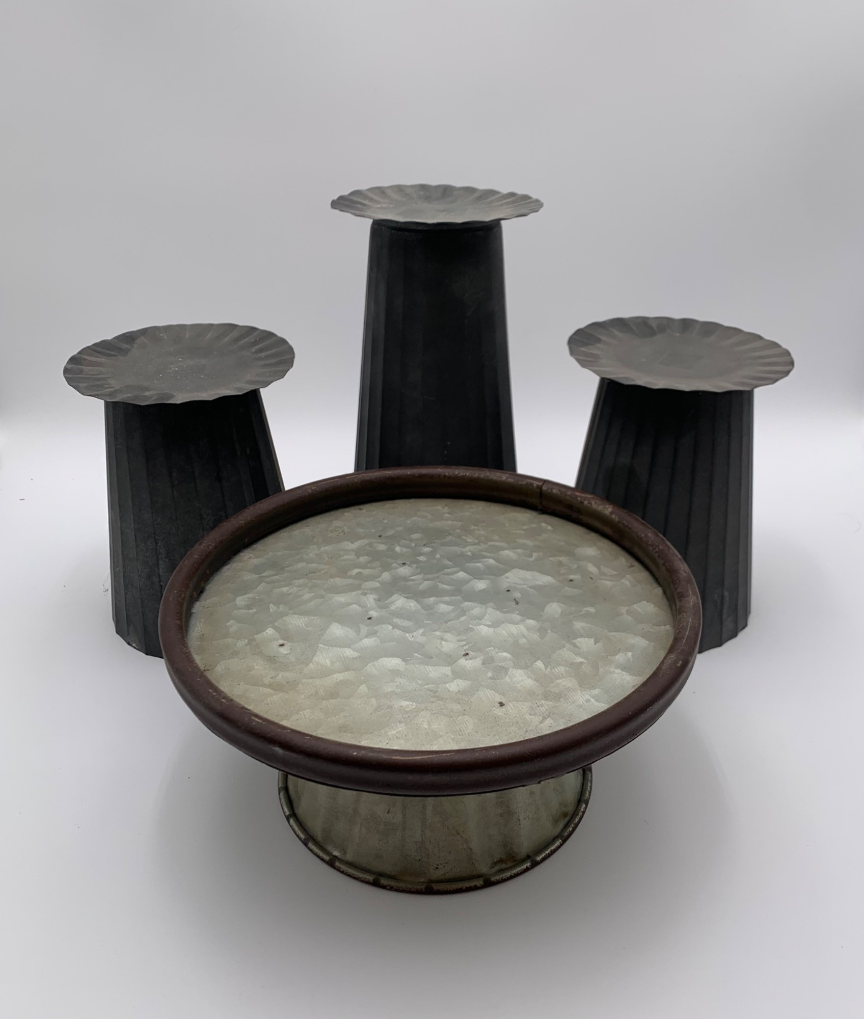 Four table top items with and "industrial chic" feel to them in terms of simplicity, construction, and material. All are of metal. Cake stand has fluted base and brown rimmed edge. Measures 5" H x 10" W. Pair of small pillar candle stands have fluted bases and ruffled edges with no rims. Measure 7" H x 5" W' Taller single pillar candle stand has fluted base and ruffled edge with no rim. Measures 9.5" H x 5" W' The candle holders could also be repurposed as industrial vases for a table centerpiece - filling them with delicate flowers would provide a great contrast to the hard metal surface.