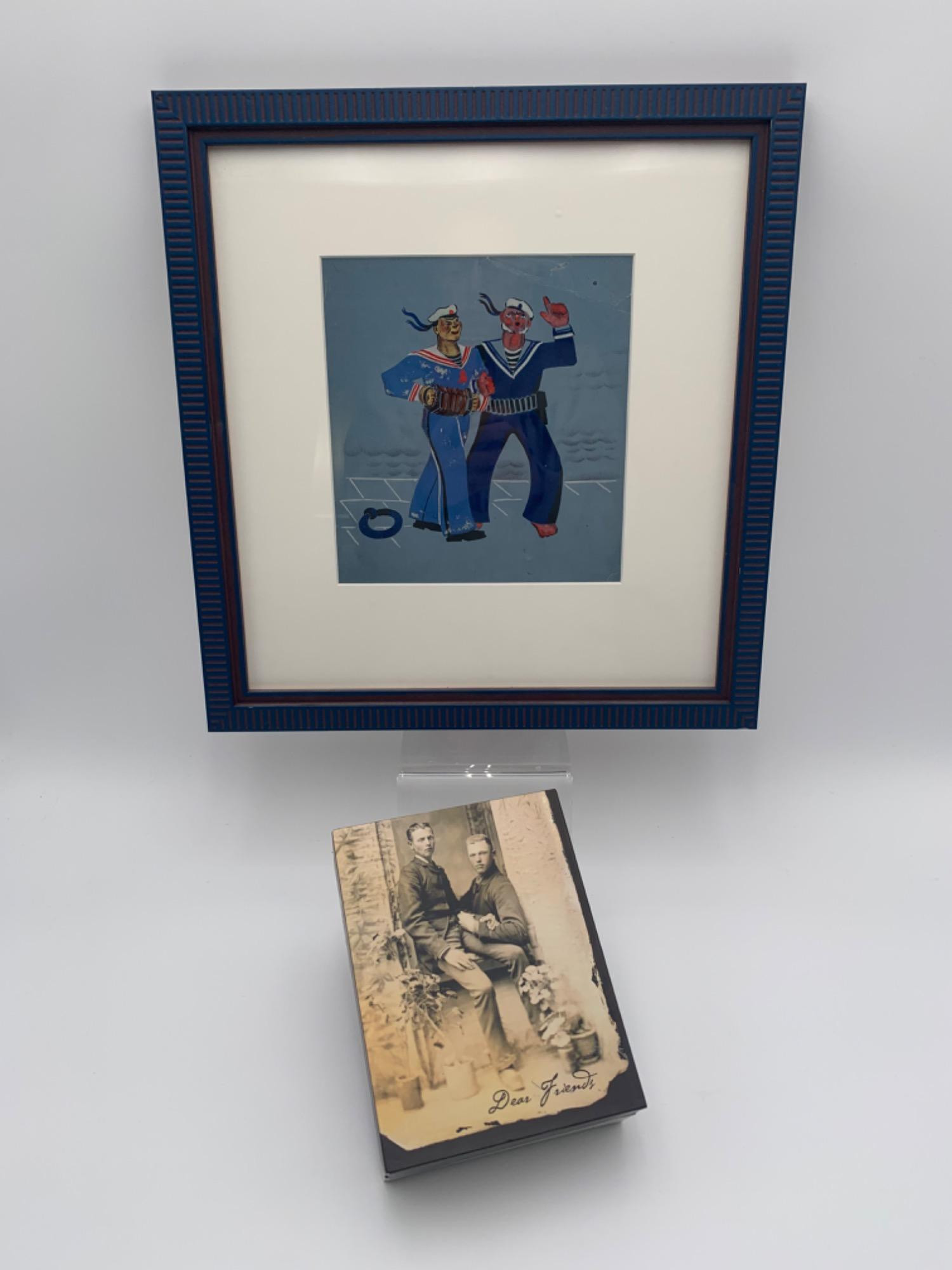 These two items portray very different interpretations of the term "Friends" - perhaps "Frenemies" might be more apropos for the painting! Small original gouache painting entitled "Japanese and Russian Sailors: Friends Again" from the early 20th C. Artist is unknown. From Greg Kucera Gallery's much missed ARTRESOURCE location in Seattle. Terrific image in a brown/blue decorative frame makes a great political statement about its time period. Measures 13.25" H x 14" W x .75" D framed. Note that there is folding and obvious wear to the paint surface which was present prior to framing. However, the client loved the 'lived in" look and chose to frame it as is was. We think it has charm that a pristine piece wouldn't have. Also included is a set of 15 notecards & envelopes from art publisher Abrams based on its book "Dear Friends: American Photographs of Men Together, 1840-1918".