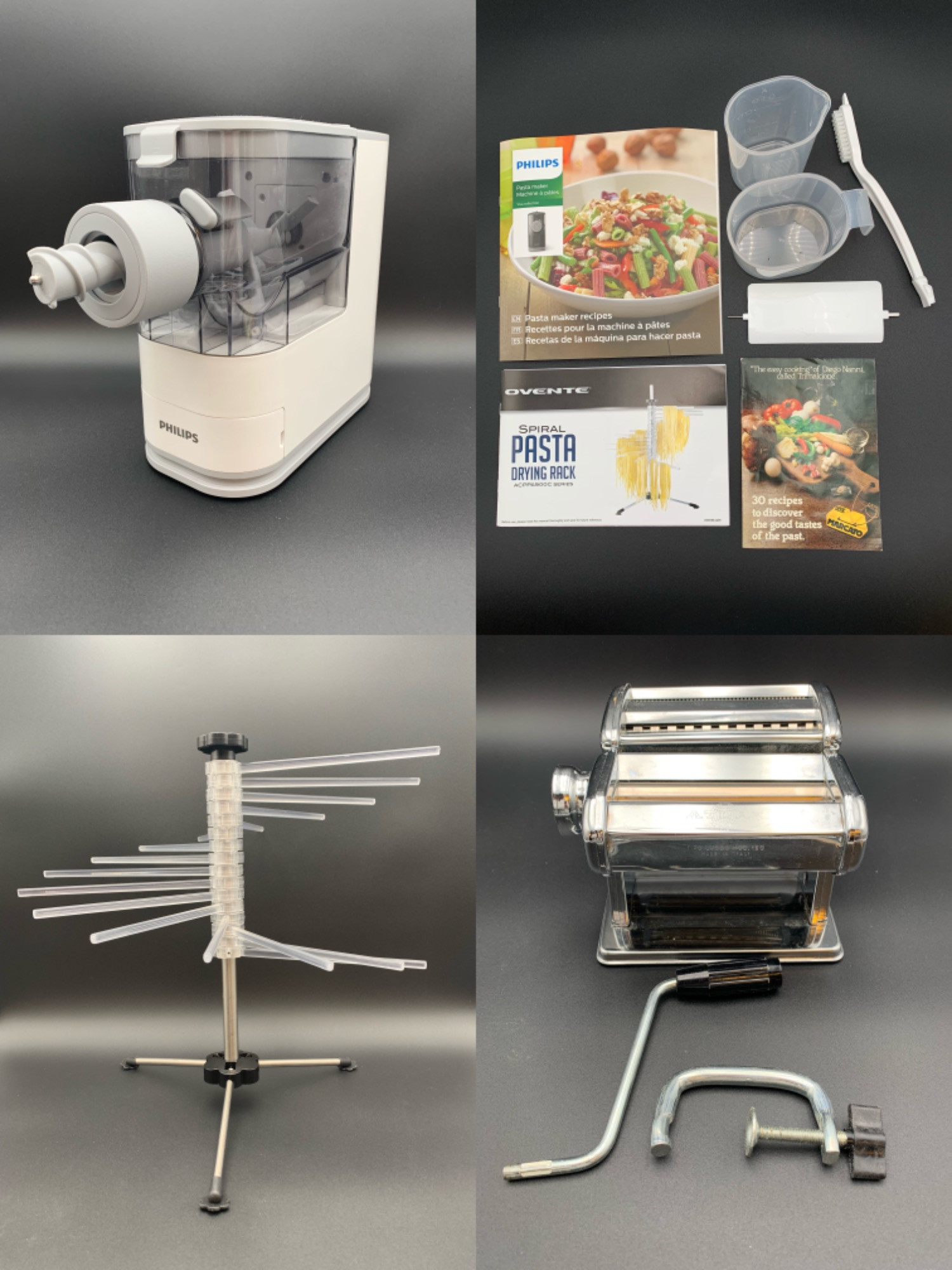 Look at this combination lot - wonderful aids to making quality fresh pasta at home - your choice of the "old fashioned" way or with the latest and greatest labor-saving maker. The first 2 items were used only once! Phillips Pasta Maker from the Viva Collection. Client purchased this in December 2023 thinking she would have lots of time to cook this winter, but only ended up using it once before finding cooking going by the wayside. This machine is automatic and makes spaghetti, fettuccini, and penne. Comes with all the tools you need and is easily cleaned. Ovente spiral pasta rack - spin the rack and the plastic arms spiral outward to dry large quantities of pasta. Fold-down stainless legs for storage. This, too, was only used one time. Marcato Atlas pasta machine from Italy. This is the traditional workhorse - heavy metal with hand-crank for the traditionalist who wants to cut and create for themselves. Stainless steel and heavy - not tested, but appears to be intact.