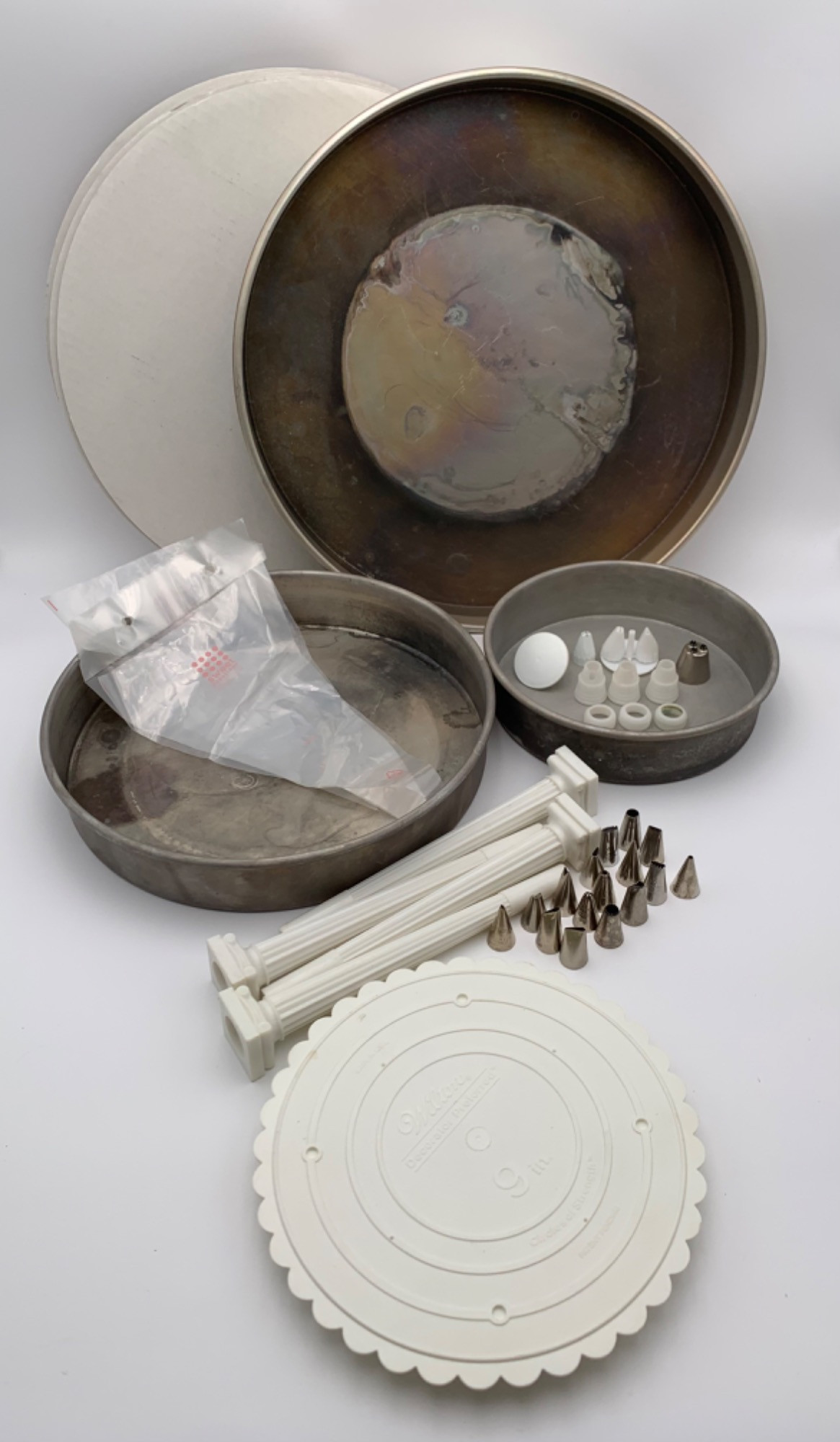 Everything you need for your wedding cake - client made her own with this set-up. Lot includes: 6 cardboard base rounds 3 metal cake pans: 16" , 12" , and 8" diameter x 2" H Frosting bags Columned Wilton stand for top tier 3 change-out plastic collars Several plastic tips & 2 flower tacks Metal tips nos. 5, 205, 352, 13,104 (2), 6, 86, 1 81, 224, 103, 47, 48. 199, 2010, & one not labeled.