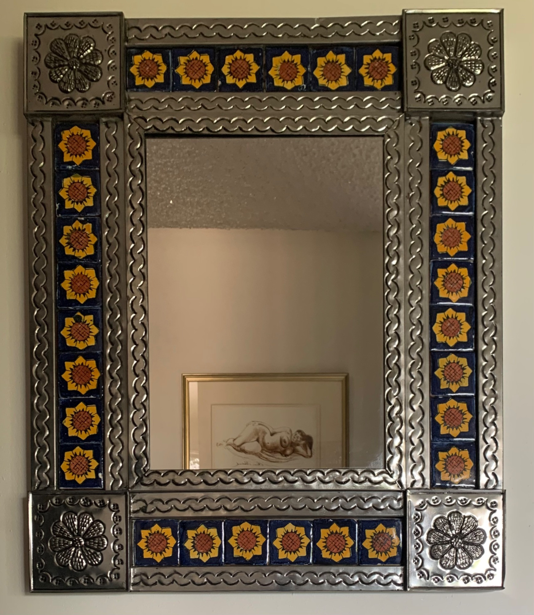 Lovely example of traditional Mexican tin metal work and colorful earthenware tile - this mirror is fanciful enough for a formal living room, but also colorful enough to add contrast to a neutral modern setting. The corner medallions measure just under 5" square with the overall dimensions of approx. 25" H x 21" W. Can be hung portrait or landscape with rear tin hooks. The tile is purposely distressed; the slight dings give the piece a lived-in feel and the mirror was purchased as you see it - it has been in storage for about 30 years. Client remembers purchasing the mirror at the Talavera Factory along the highway in Cabo San Lucas circa mid-1990s.
