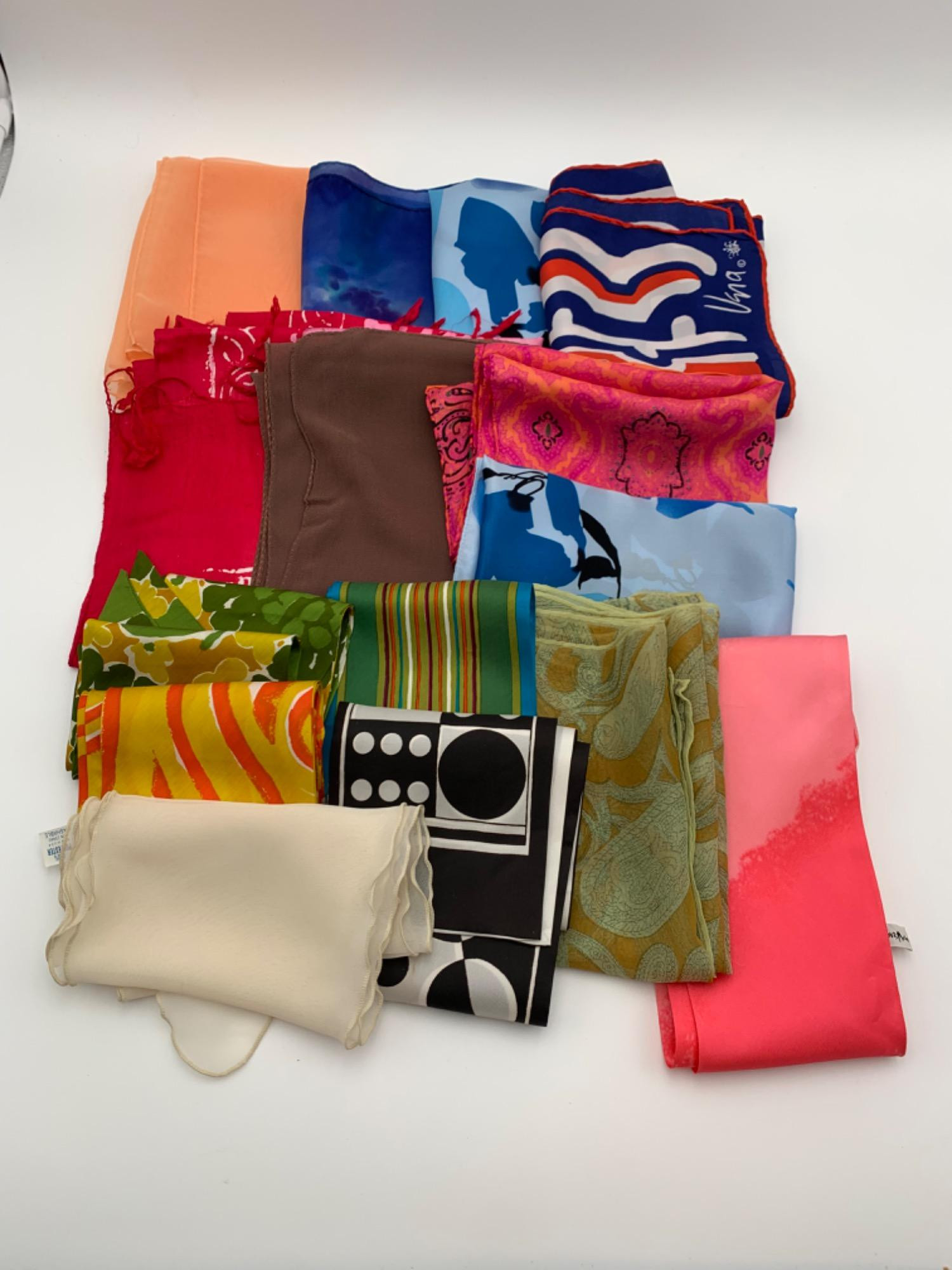 Large lot of scarves - many are silk, some acetate, and some nylon. From everywhere - US, Japan, & Iran. Please note that these have been in storage for at least 30 years - they are wearable, but some need a good clean/stain remover - see last 5 photos.