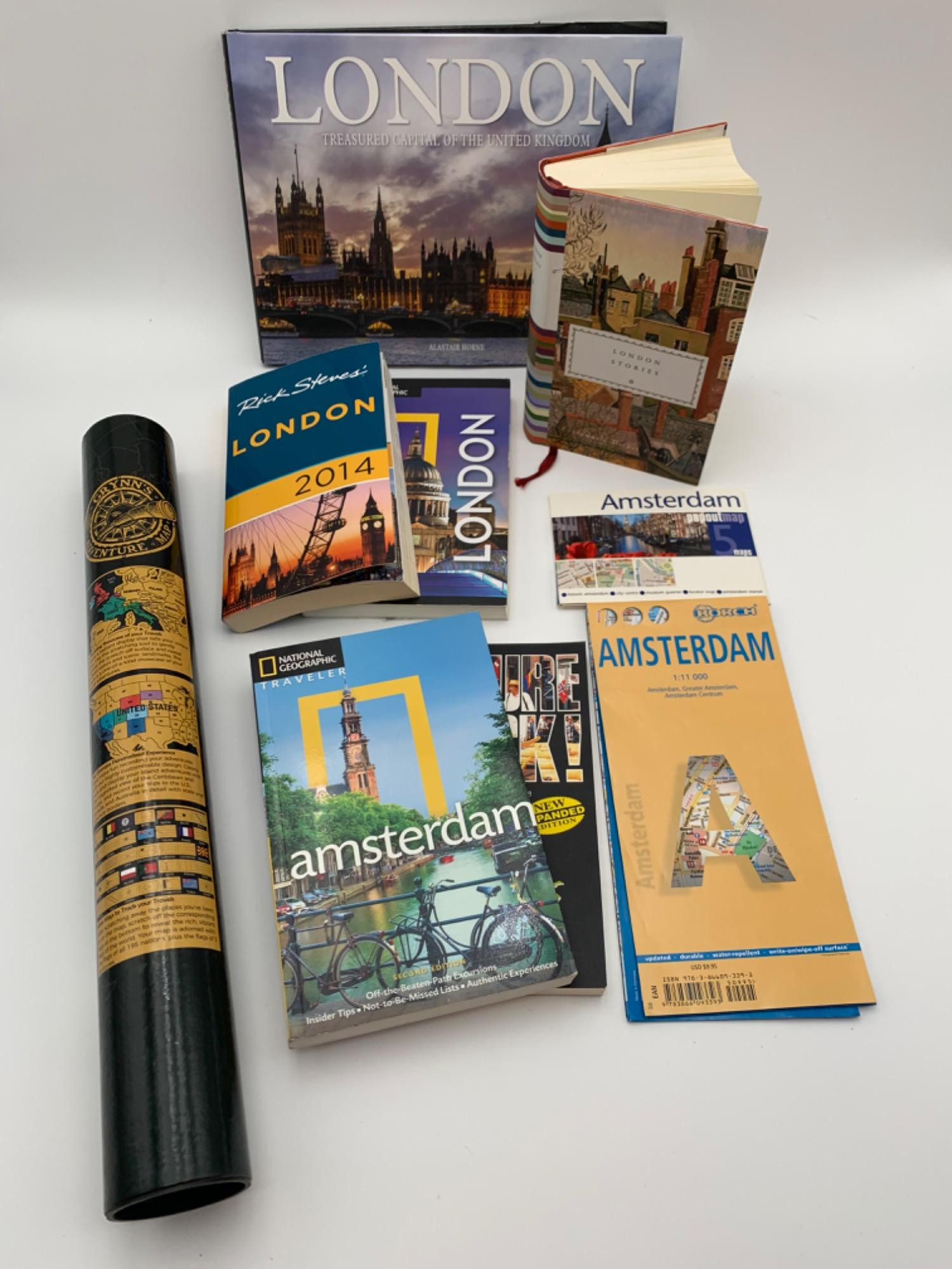New, unused Scratch-off travel poster to keep a record of all the places you've been (last 3 photos show an identical used one with some places scratched off). Measures 17" H x 24" W. Guidebooks by various authors & publishers: Nat Geo Traveler - Amsterdam - 2014 Culture Shock - The Netherlands - 2003 Nat Geo Traveler - London - 2021 Everyman's' Pocket Books - London Stories - 2014 Rick Steves - London - 2014 London Treasured Capitol of the UK - 2019 plus misc. maps.