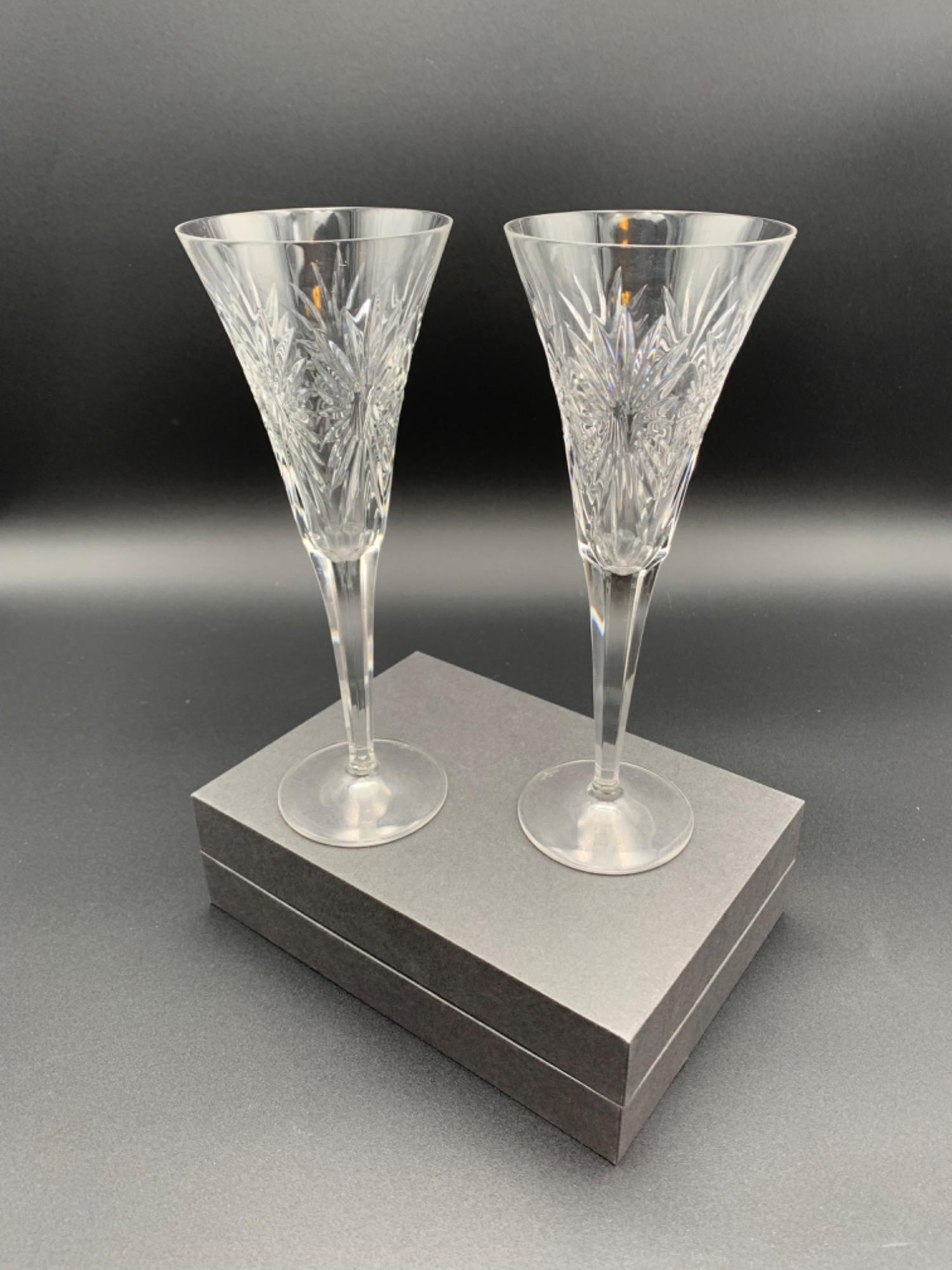 Exquisite pair of toasting champagne flutes from famous-maker Waterford Crystal celebrating the turn of the millennium. This is the 3rd set in a series of 5 flute pairs specially created for the Year 2000 celebration. This set was made in Germany. Starburst signifying health on the upper portion with straight edge bevels on stem. Waterford signature on base of each. Measure 9.25" H. Comes with original box from Nordstrom. Same flutes for another seller on line Other flutes/pieces from this series in Lot #10, Lot #168, Lot #171, and Lot #174.