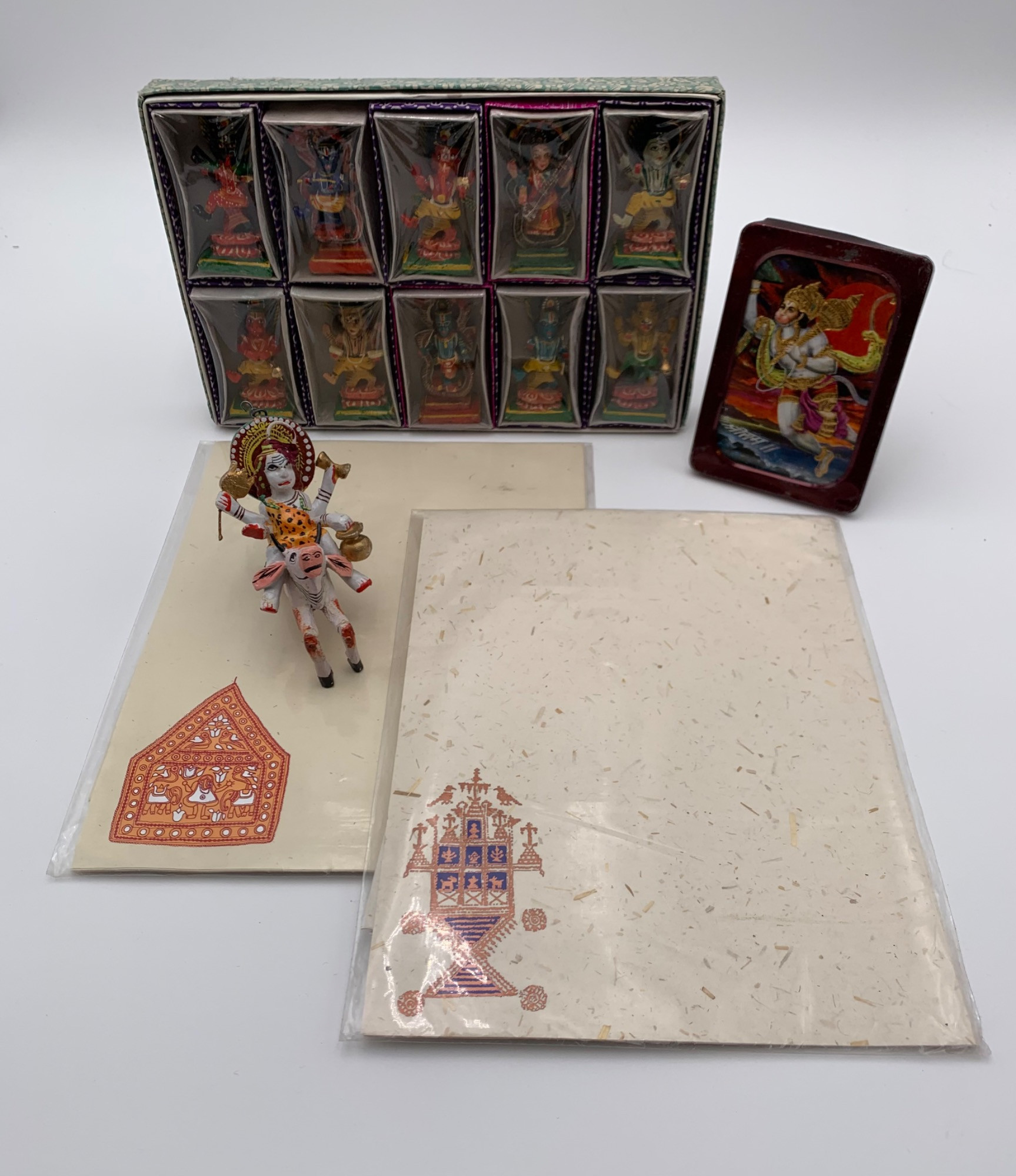 Group of Indian items from client's last trip there about 30 years ago. Unopened packages of 10 wooden hand-made ornaments of various Hindu deities. Each stands approx. 3" H. Please note that one figure is missing his exterior gift box cover. Single larger ornament measures 5" H. 2 unopened packages of handmade rag tree stationary; measure 10.75" H x 8.5" W (10 sheets of paper & 10 envelopes in each package.) Also included is a small likeness of Hanuman in an old frame.