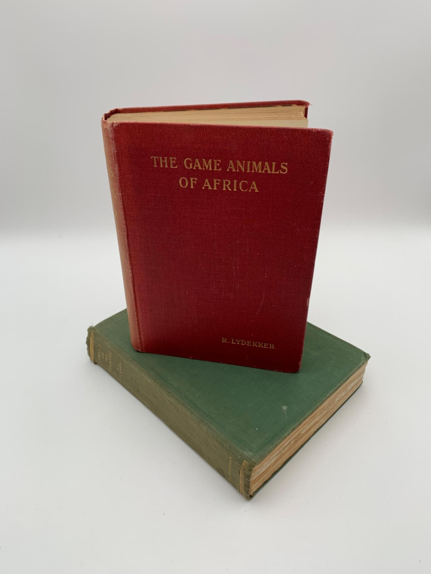 Client's father was a big game hunter from Alaska who hunted in the Americas and Asia. These books are from his reference collection. Note that unlike his other books, these are about Africa - per client's father "The only thing I would shoot in Africa is a camera - hunting should be a match of wits with tracking and physicality, not riding around in a jeep and shooting things." THE GAME ANIMALS OF AFRICA by R. Lydekker. Hardcover. 1908, Rowland Ward Ltd. (London, UK). 484 pages. Written by a zoologist & naturalist, this is a comprehensive guide to large and small animals in Africa including rhinos, elephants, leopards, etc. Contains hunting & habitat information as well as good quality plates compared to books of similar vintage. In used condition, but hard to find first edition. TRAILS OF THE HUNTED by J.L. Clark. Hardcover. 1929, Chatto & Windus Publishers (London, UK). 269 pages. Foreword written by Kermit Roosevelt. Covers large animal game - mostly in Africa, but on some other continents, too. Lots of illustrations. Condition is used, but still in ok shape. Note signature on flyleaves and title page. Same books on line with other sellers: https://www.abebooks.com/servlet/BookDetailsPL?bi=6065304121&ref_=ps_ggl_17738760402&cm_mmc=ggl-_-COM_Shopp_Rare-_-product_id=bi%3A%206065304121-_-keyword=&gclid=CjwKCAjwjeuyBhBuEiwAJ3vuoYRU9d1l68o2OlDbiU7ZsNWUY0RzdEZ6_L7NvvhagFgGTp4ph6MhXBoCD08QAvD_BwE https://www.abebooks.com/Trails-Hunted-CLARK-James-L-Chatto/21738055784/bd