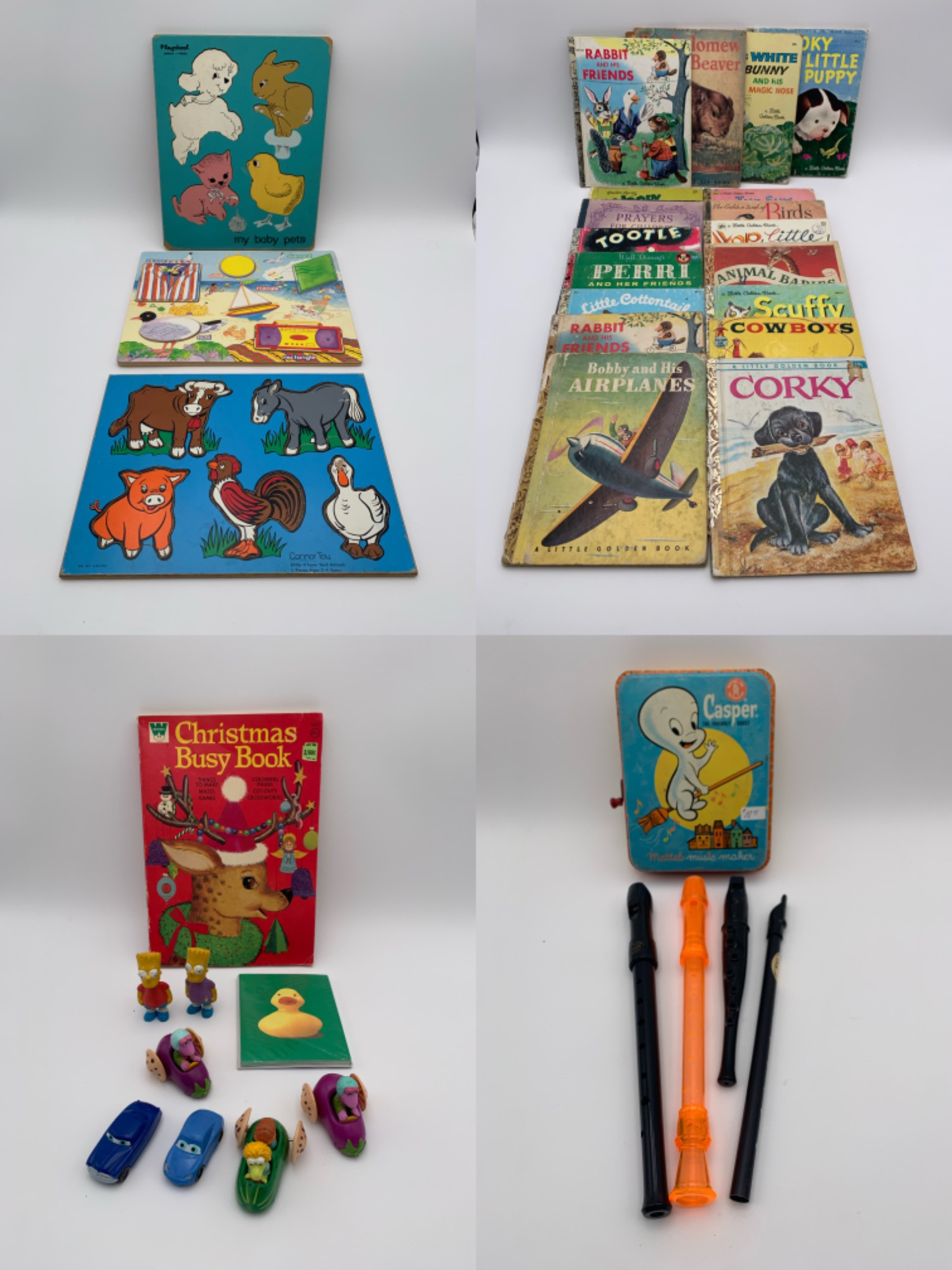 Mixed lot of different items to keep the young set entertained without worrying about damage to the items. All items have been well-loved and are in used condition, but still have lots of life left. Chances are your little visitors haven't seen these before since they are quite old. Lot includes 4 recorders/whistle flutes, Caspar wind-up music box (plays Hickory Dickory Dock in a haphazard way), veggie vehicles with Muppet characters in them, a couple of Bart Simpson figures, a Christmas activity book, a couple of plastic cars, some rubber duckie notecards, 3 VERY simple wooden puzzles, and a large number of classic kid books. Great to have stashed away in a closet for unexpected little guests.