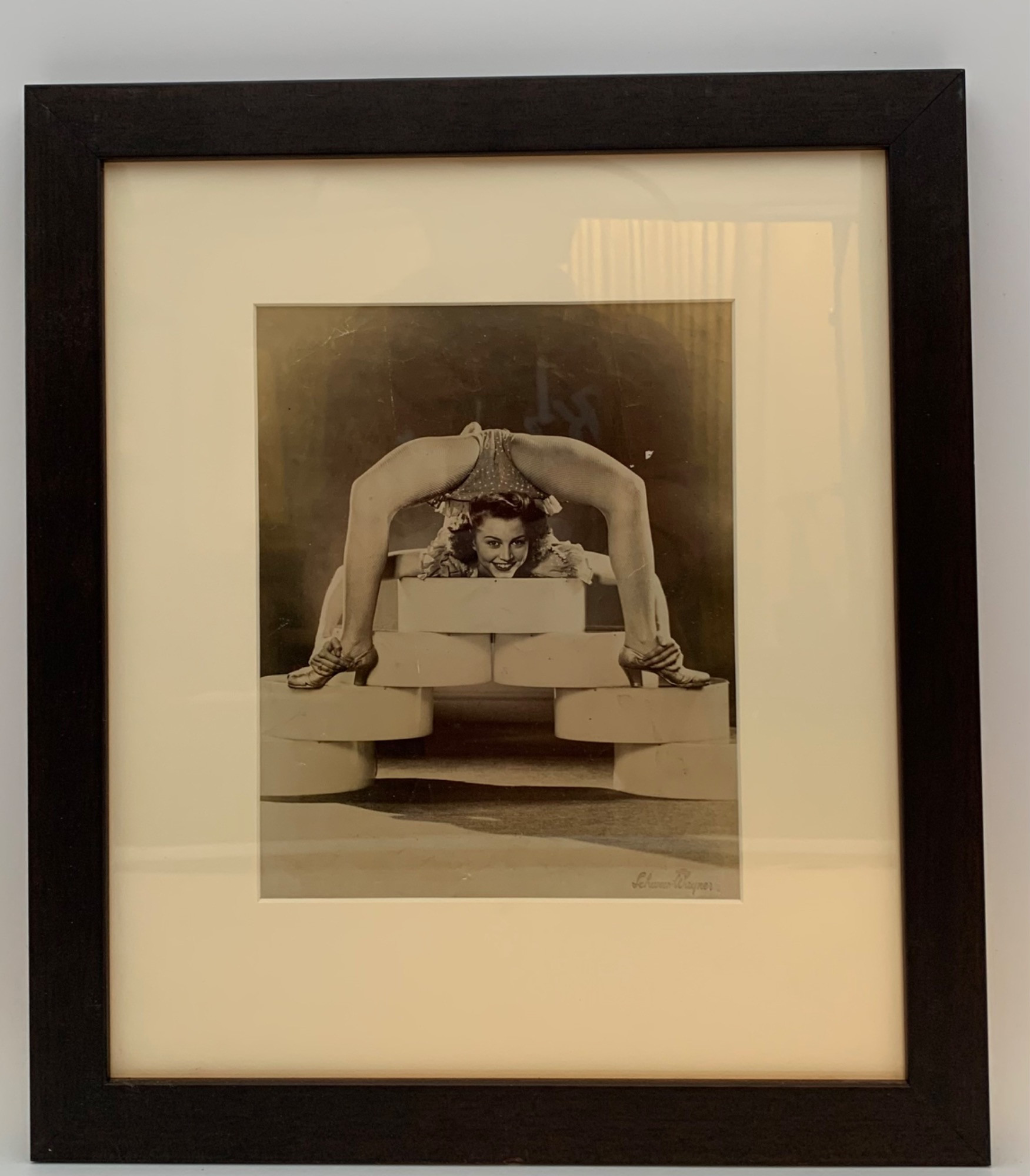 This is a truly odd vintage photo - young female contortionist in what looks like an impossible position for 99% of the population! Given the style of shoes and fishnet stockings, we are guessing this is from the 1940s or so - but a bit risqué for the time. Signed "Schween-Wagner" in the lower right. The photo itself is vintage in sepia tones and shows its age when light strikes it from certain angles (crease in upper left corner). There is also a small scrape to the photo paper above her left knee. Client loved the photo though, and chose to have it framed in professionally by Gallery Frames in ebonized brown-black wood.. We like the flaws as it speaks of age and sentiment. Note that the frame has a very slight wrinkle/flaw in the lower center, but it has been repaired and is barely noticeable - see last photo. Measures just over 16" H x just over 14" W.
