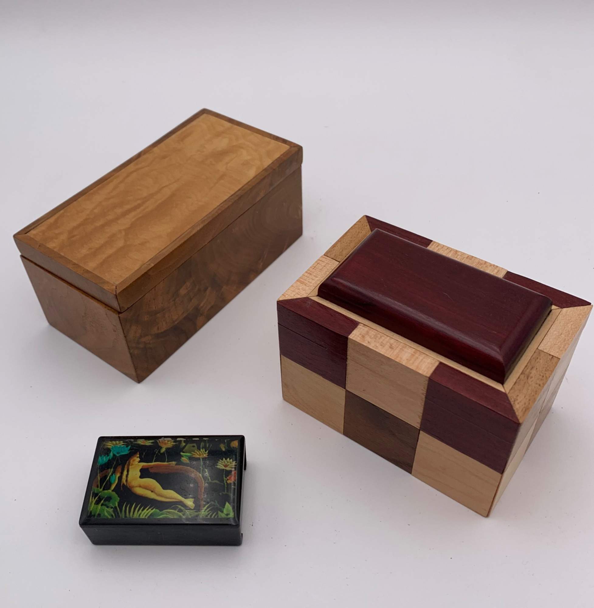 Group of 2 handmade boxes of wood - client says these were purchased from an artisan on the Olympic Peninsula - in excellent condition. Also includes a commercially made small match box. Rectangular box of light and dark wood with great wood grain measures 2.75" H x 6" L x 3" D. Checkerboard box in light and dark wood with stepped lid measures 3.25" H x 4.5" L x 3" D. Green felted interior. Commercially produced plastic matchbox with Rousseau's "The Dream" on the top. Measures shy 1" H x 2.75" W x shy 1.75" D. Note that there is some abrasion on one side of the box - see last photo. Additional boxes by same artist in Lot #93