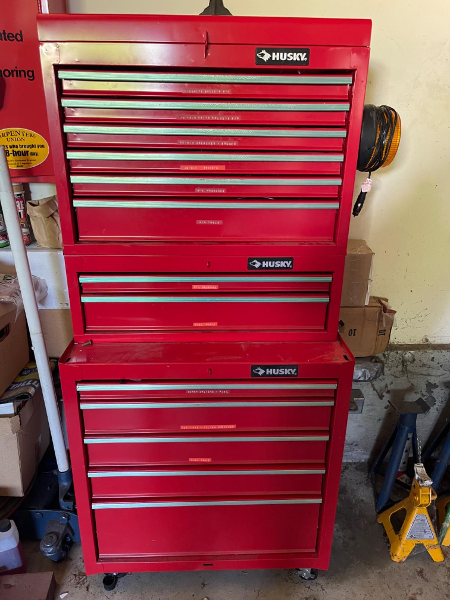 Husky Tool Chest Loaded With Tools-See Details. 58"T x 27"W x 17.5"D (top detaches)