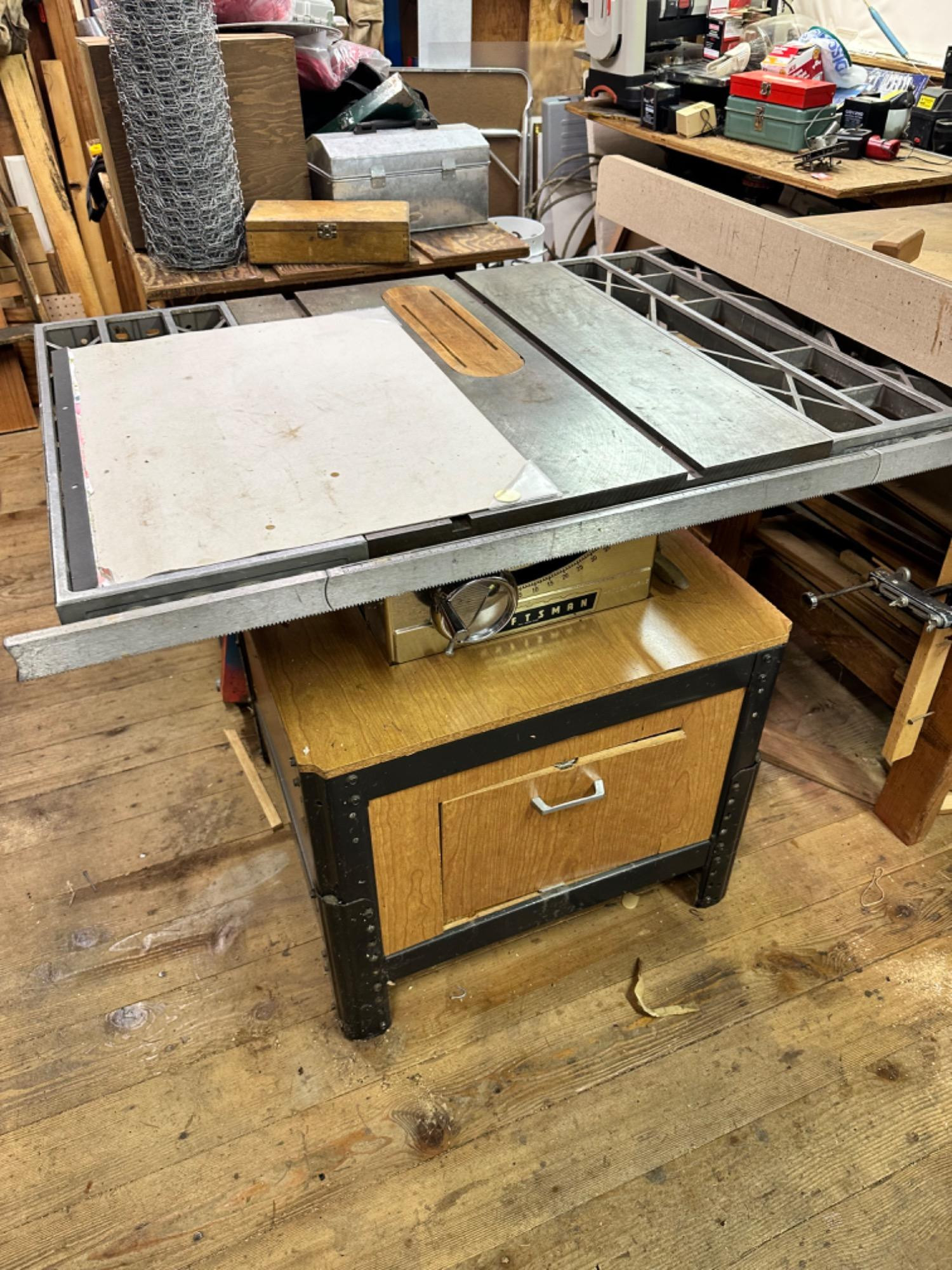 Sears and Roeback Bench Saw 10" on Tilting Arbor Extension Table Bench saw on stand measures 43 D x 28W x 34.5T measurements do not included extension. Saw powers up.