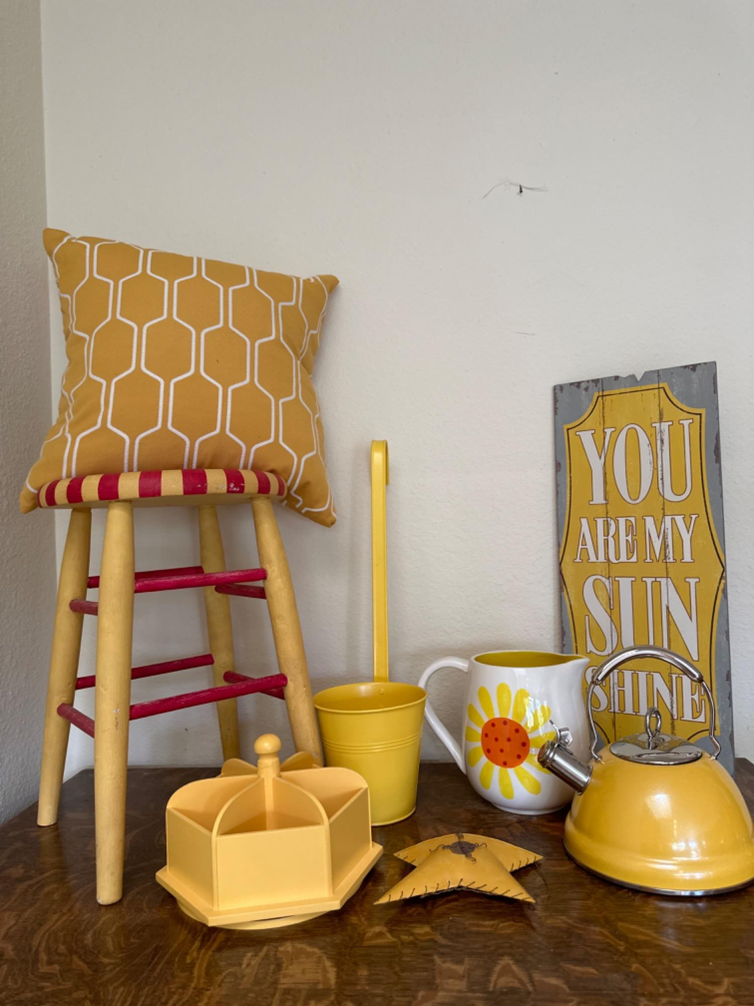 Hello Yellow! Pacific Rim Pitcher and Other Fun Yellow Decor Items. Vintage Pacific Rim sunflower themed pitcher, tea kettle, Hanging container, rotational caddy, metal star wall decor, stool, pillow and sign.