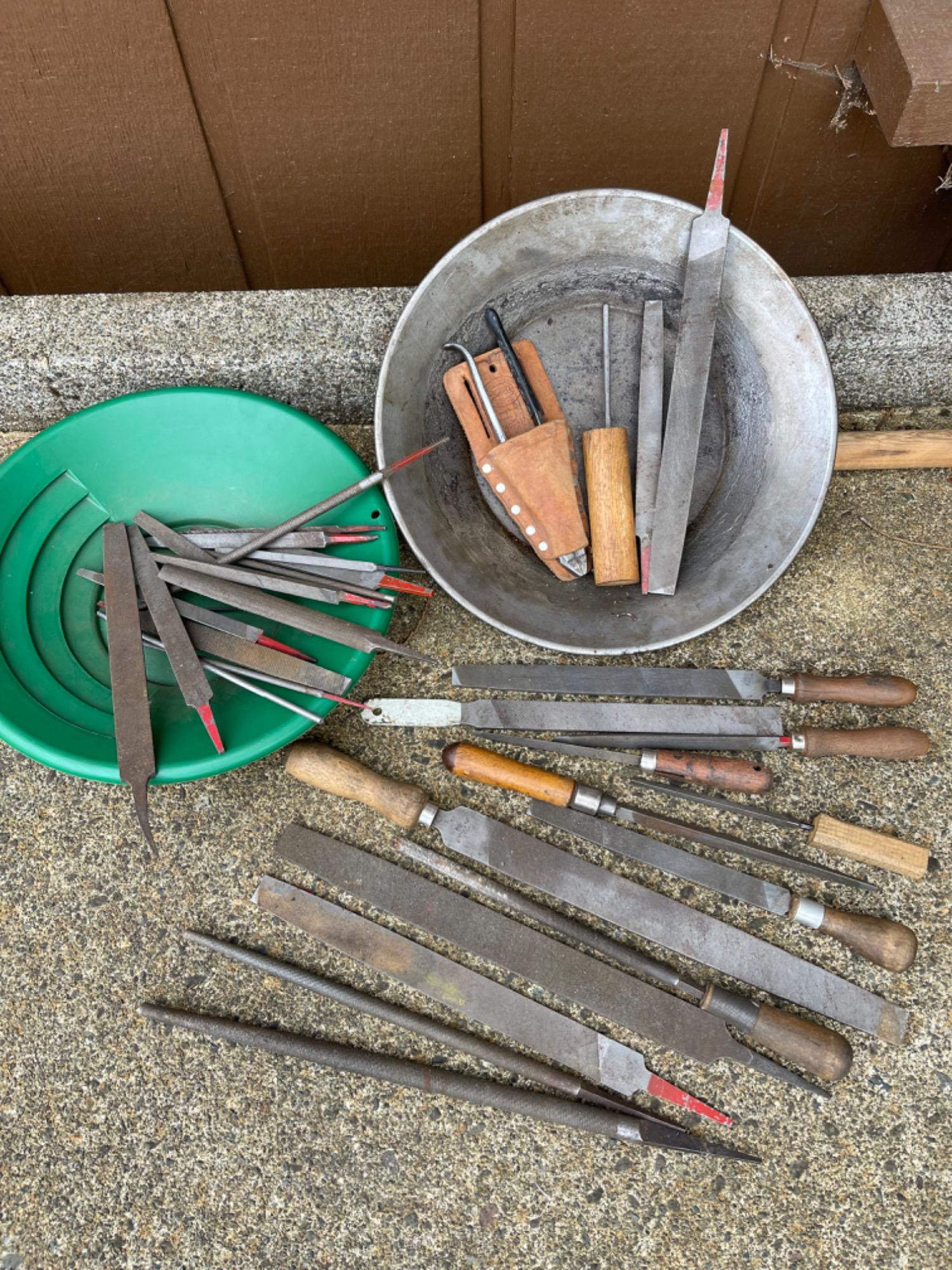 Assorted files (some antique) and Gold Mine Pans