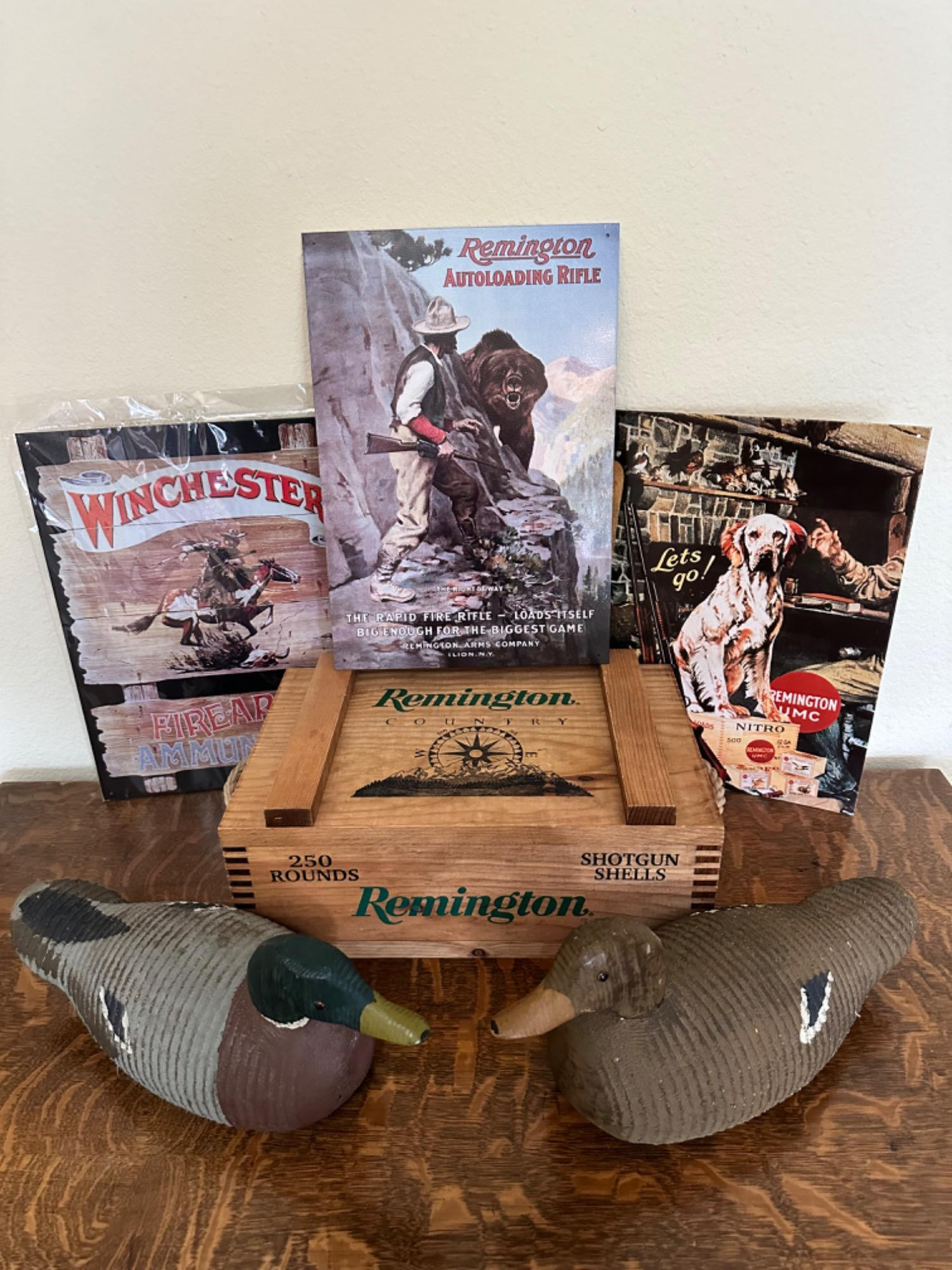 Carved Wood Duck Decoys, Metal Signs and Remington Wood Box. All three signs are reproduction. Ducks are not signed.