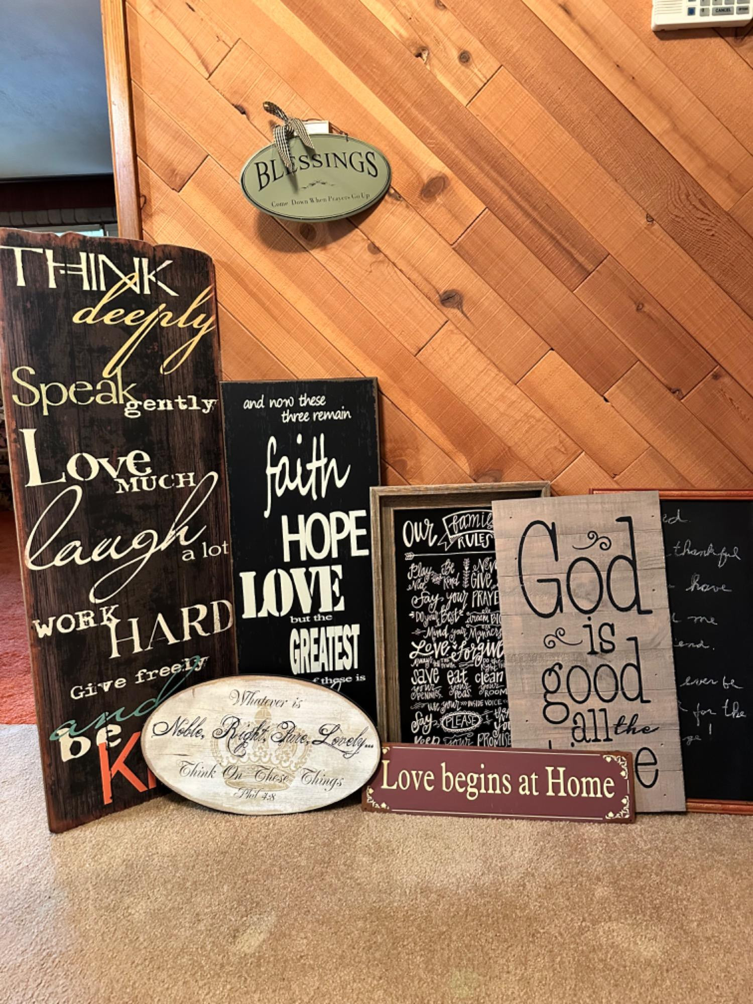 Inspirational signs mostly wood. Largest- 41.5 Tall x 15 W Smallest-6 Tall x 10 W