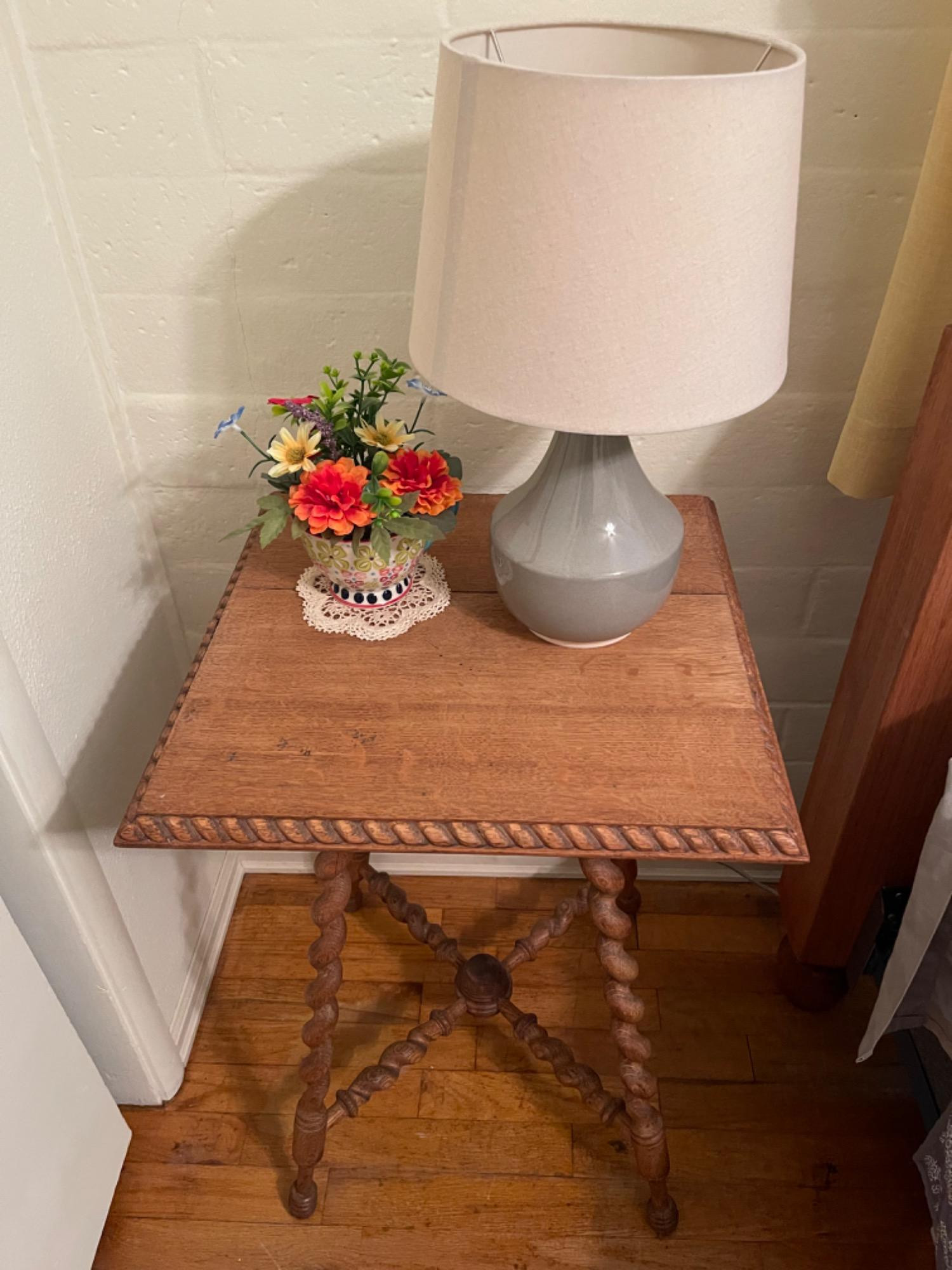 Barley Twist Side Table With Lamp and Floral Decor. Table measures- 18 x 18 x 26T