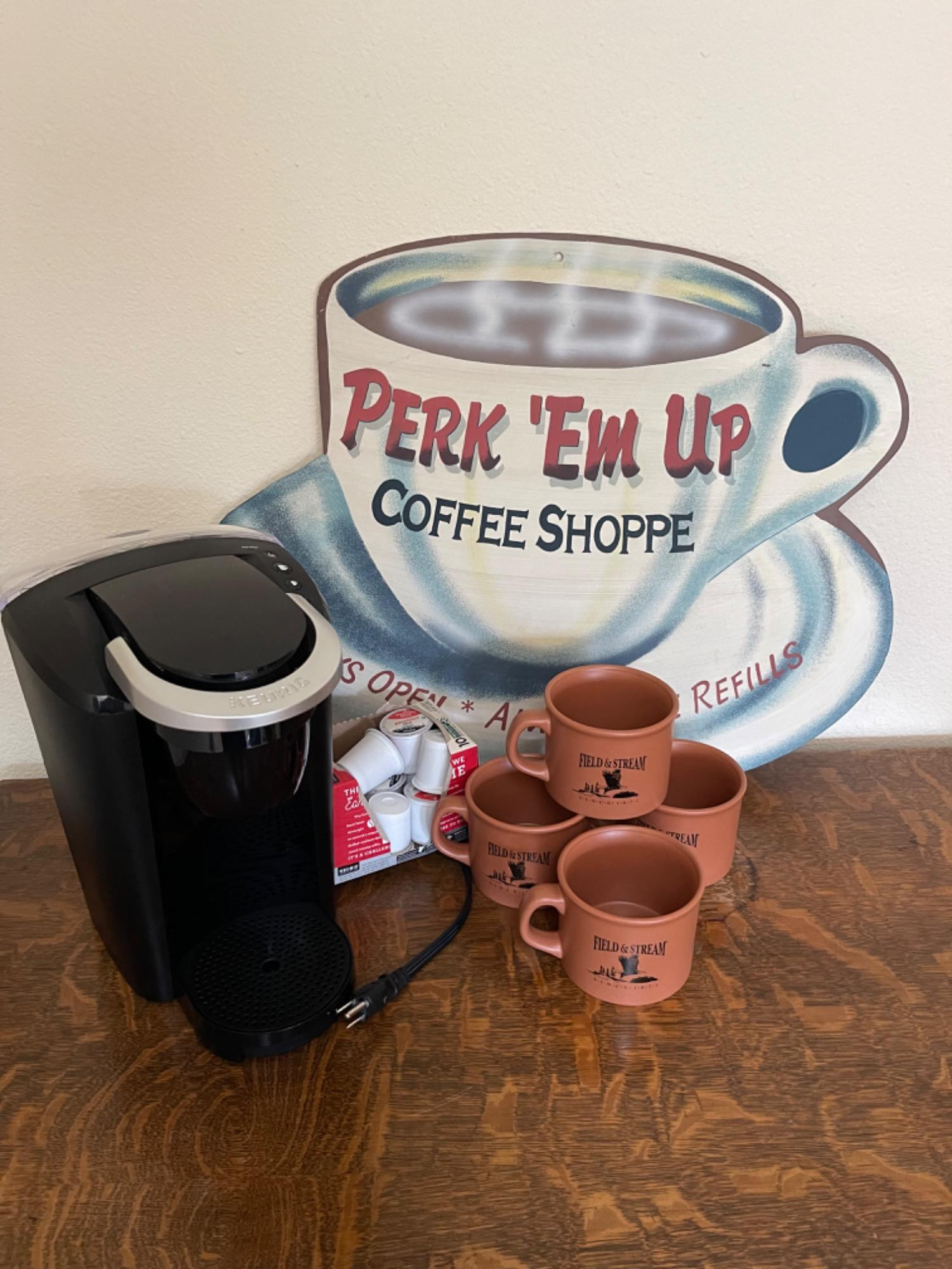 Slightly Used Keurig, Field & Stream Mugs and Coffee Sign.