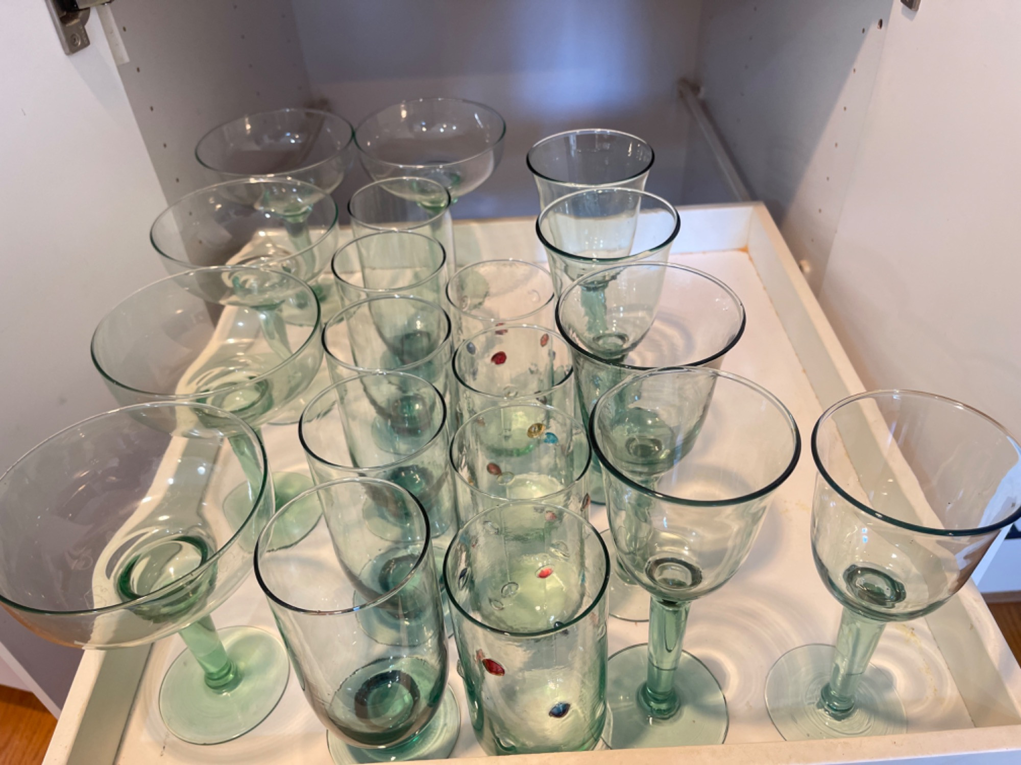 Shortest: 6 inches tall Tallest: 8.75 inches tall Paint on bubbles of no stem glasses are coming off. No major chips in any.
