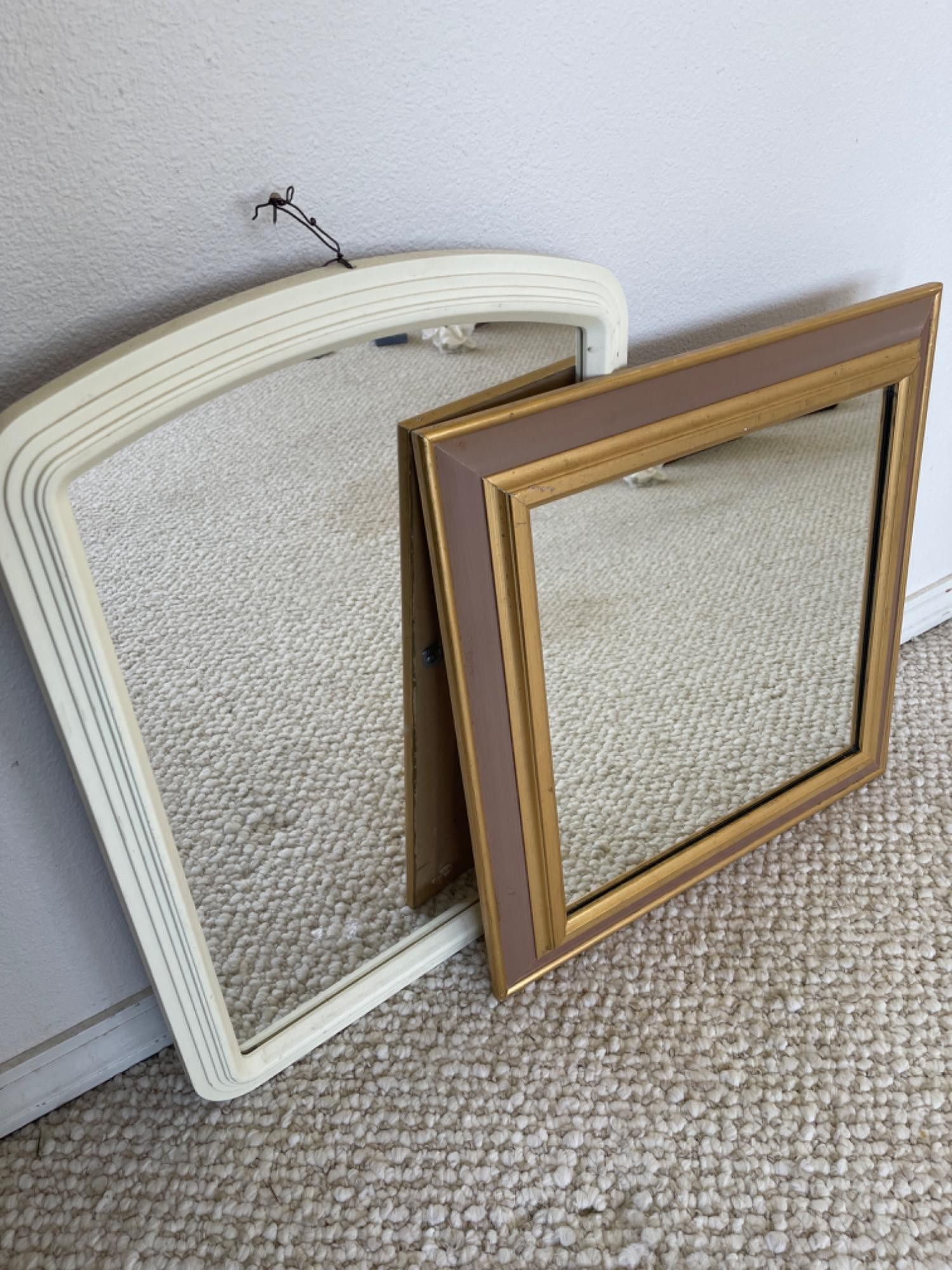 Square Mirror: 18.5 x 18.5 White Mirror: 16 inches x 22 inches Both have staining and scratches both to mirror and frame. Need cleaning.