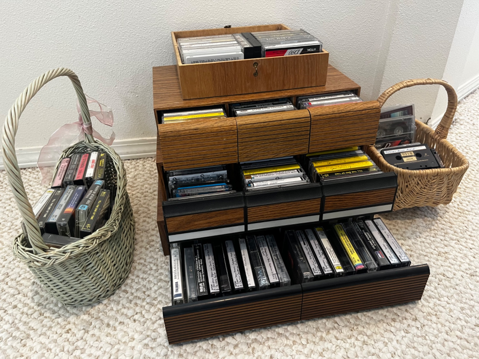 Measurements of Boxes: Smallest: 3.5 x 5.5 x 10.5 inches Largest: 3.75 x 12 x 17 inches Details: Loads of different tapes of mostly classical music. Carrier boxes are in good condition, drawers open and close easily