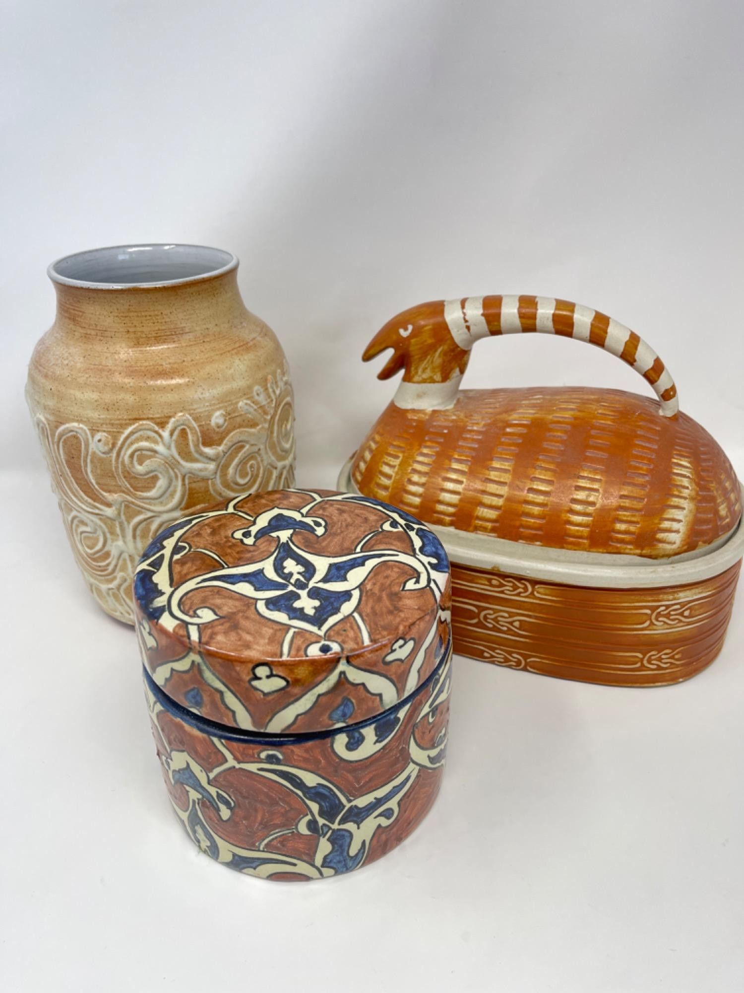 Parker Pottery: 8.5 inches tall Sigma Stoneware Casserole Dish: 9.5 inches wide Jar w/ Lid: 5 inches tall