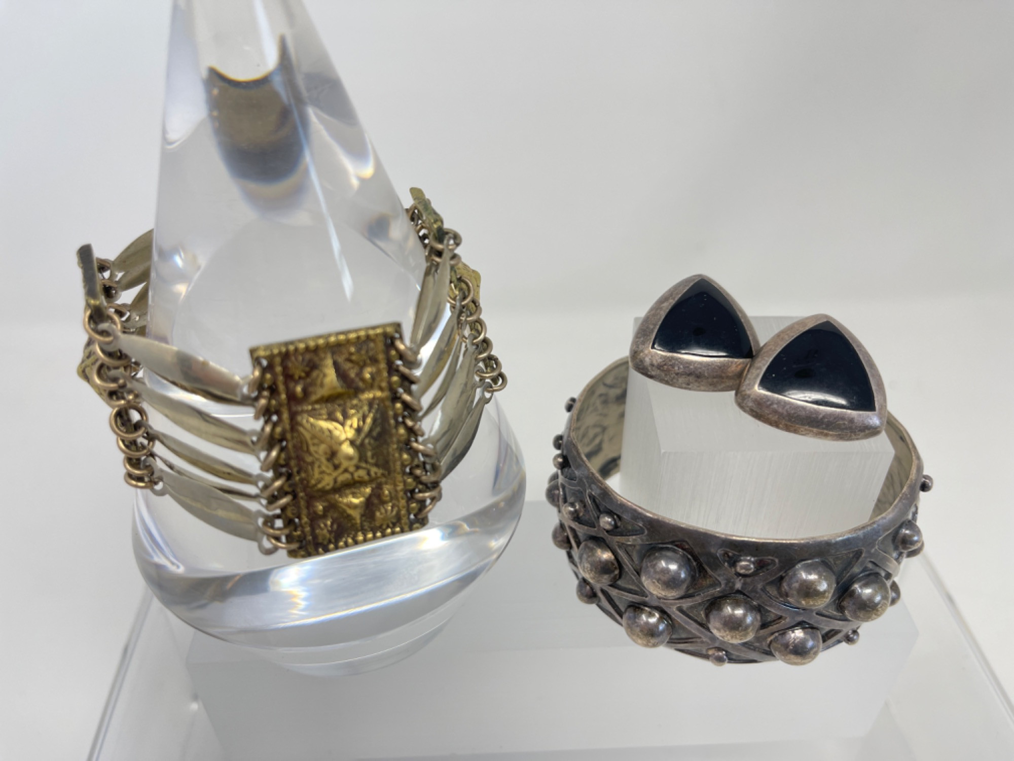 Cuff Bracelet: - 2.75 inches wide - 58g Clip-On Earrings: - 1 inch wide - 16g Alpaca Bracelet: - 7.5 inches long - 50g All need cleaning. Displays not included.