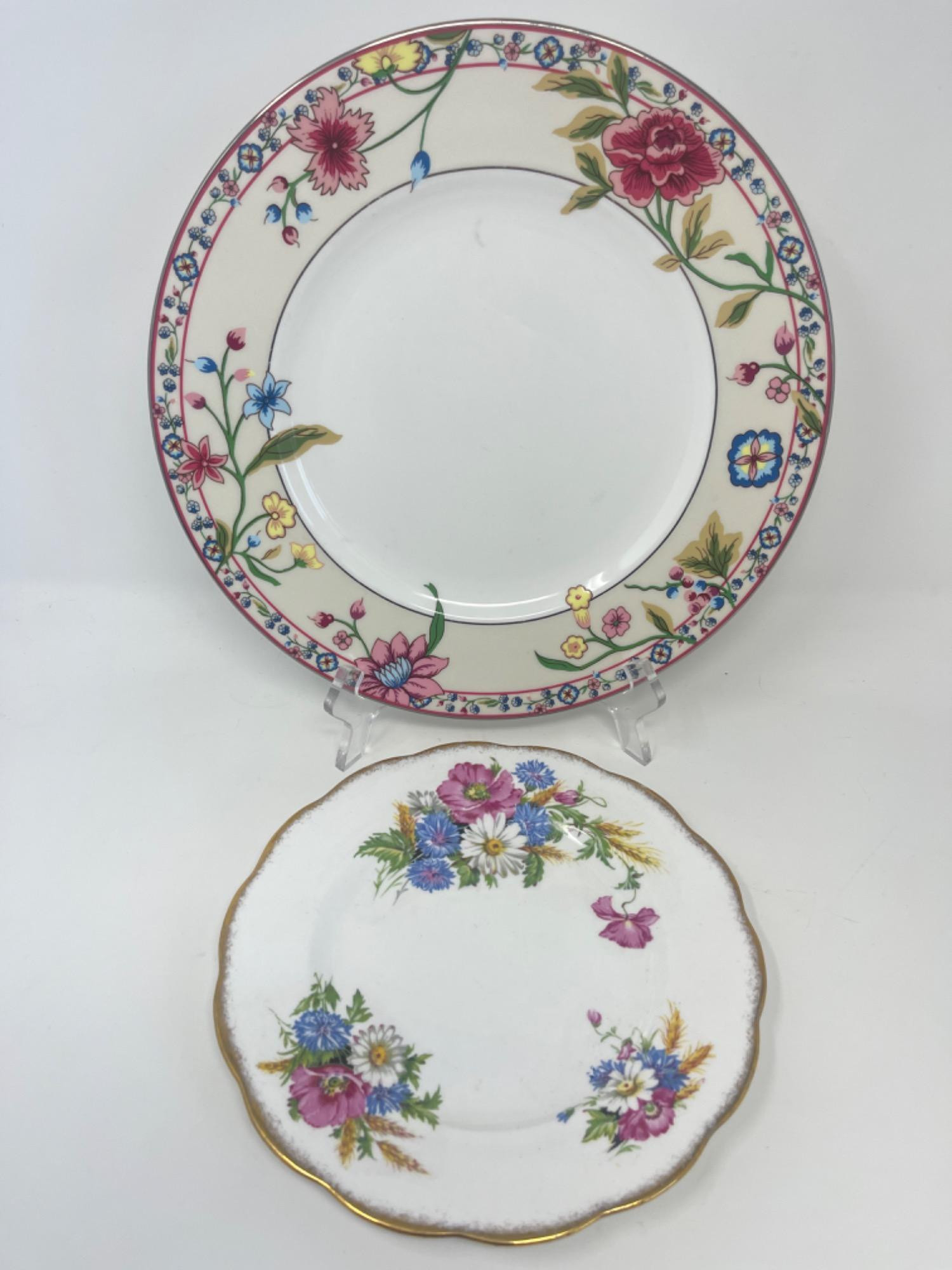 (1) Scalamandre by Lenox Dinner China Plate: 11 inches wide (1) Royal Albert England “Harvest Bouquet Bone China Salad Plate: 8 inches wide Few small stains.
