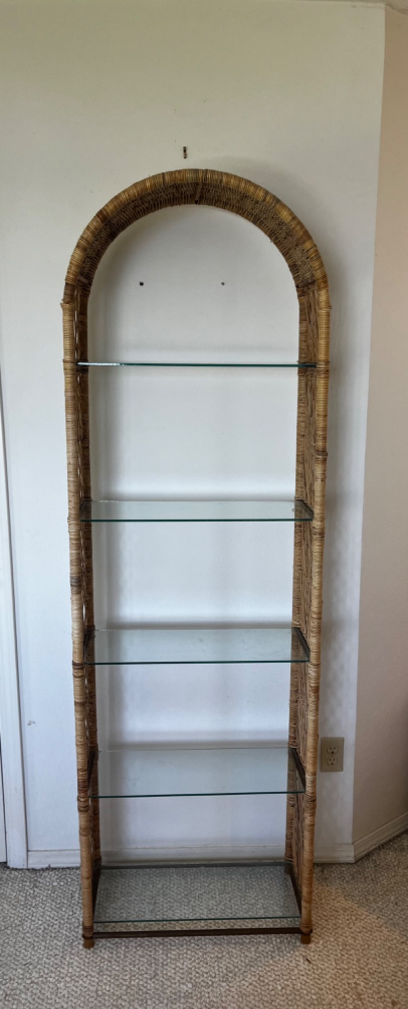 Measurements: 24.5 inches W x 11.75 inches D x 77.75 inches H Wicker is in decent condition. Some pieces sticking out from the rest. Weave is still intact. Glass has scratches and markings on it but nothing too extreme. Bidding on this lot is an agreement that: (1.) You will have 2 capable, able bodied persons to lift and load at a minimum. (2.) You will bring a hand truck and/or any other tools needed to remove this item. If these steps are not followed your item will be forfeit and no refund given.