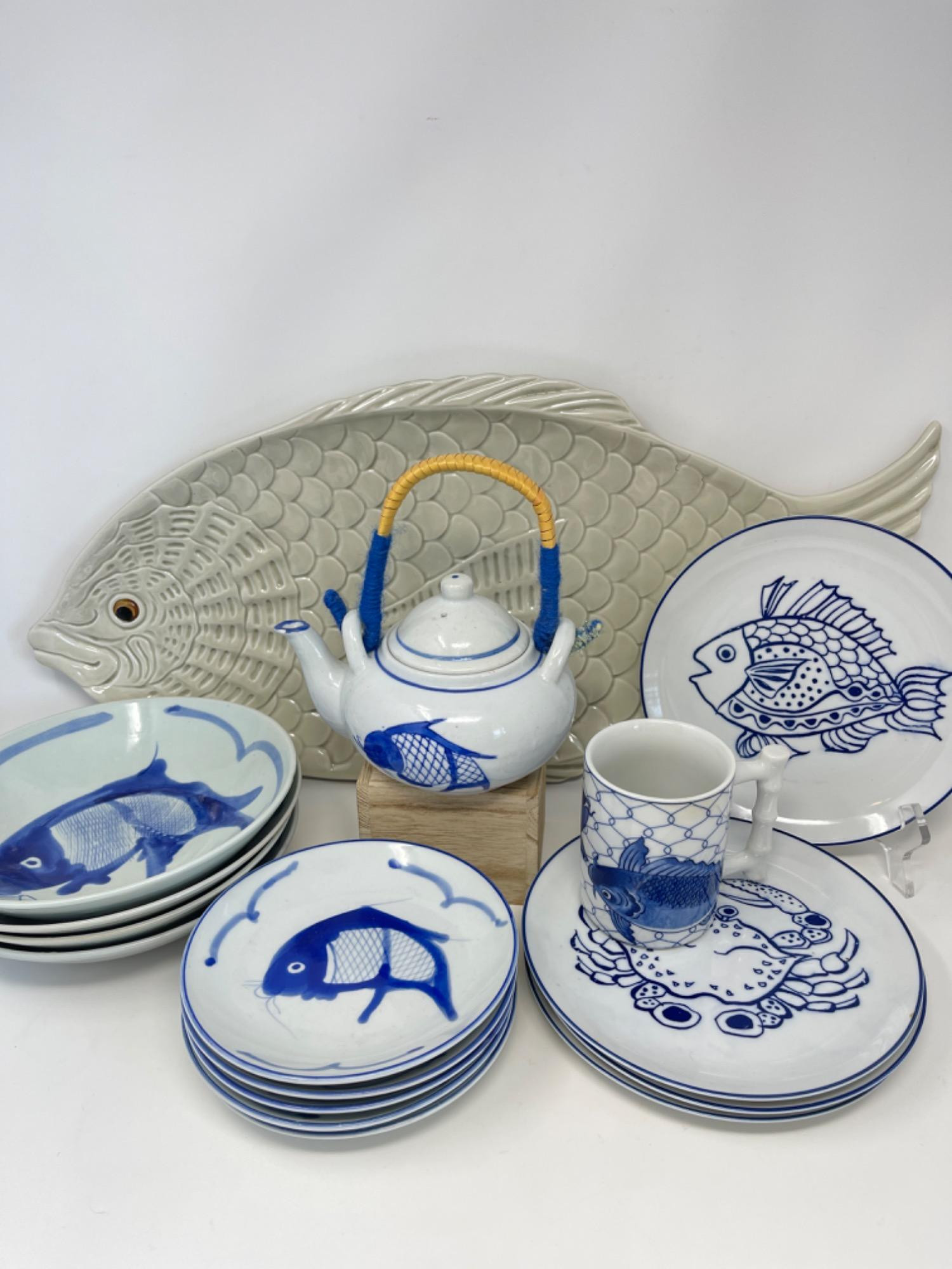 (4) Chinese Hand Painted Bowls (5) Chinese Hand Painted Small Plates (1) Tea Pot (1) Mug (4) Matching Sea Creature Plates (1) Hand Painted Fitz and Floyd Fish Serving Platter