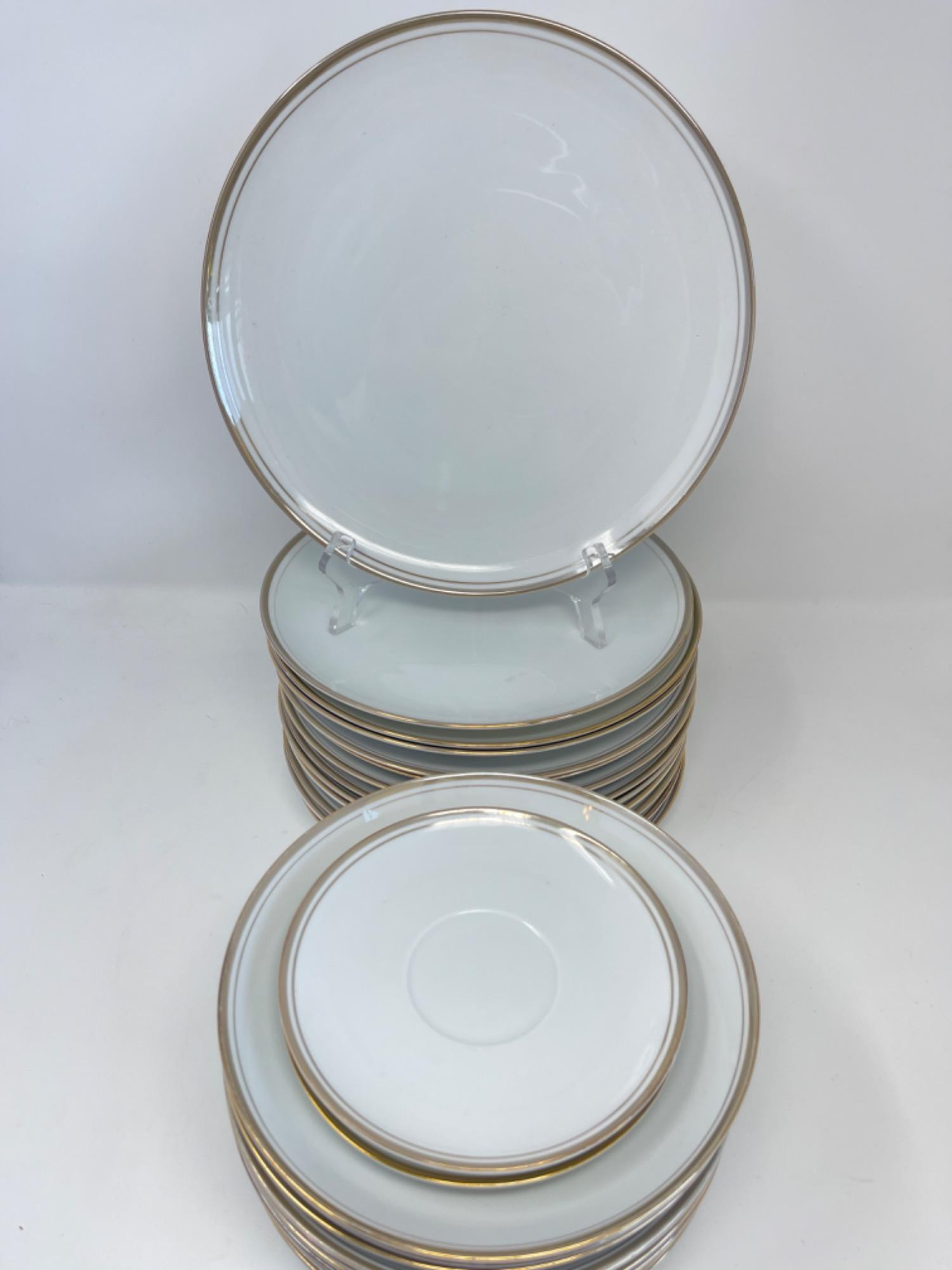 “Golden Elegance” (12) Luncheon Plates: 9.25 inches wide (11) Dinner Bowls: 7.5 inches wide (1) Dinner Plate: 10.25 inches wide (2) Saucers: 5.75 inches wide No large chips or cracks, but there is some tarnishing to the gold rim on some of the plates.