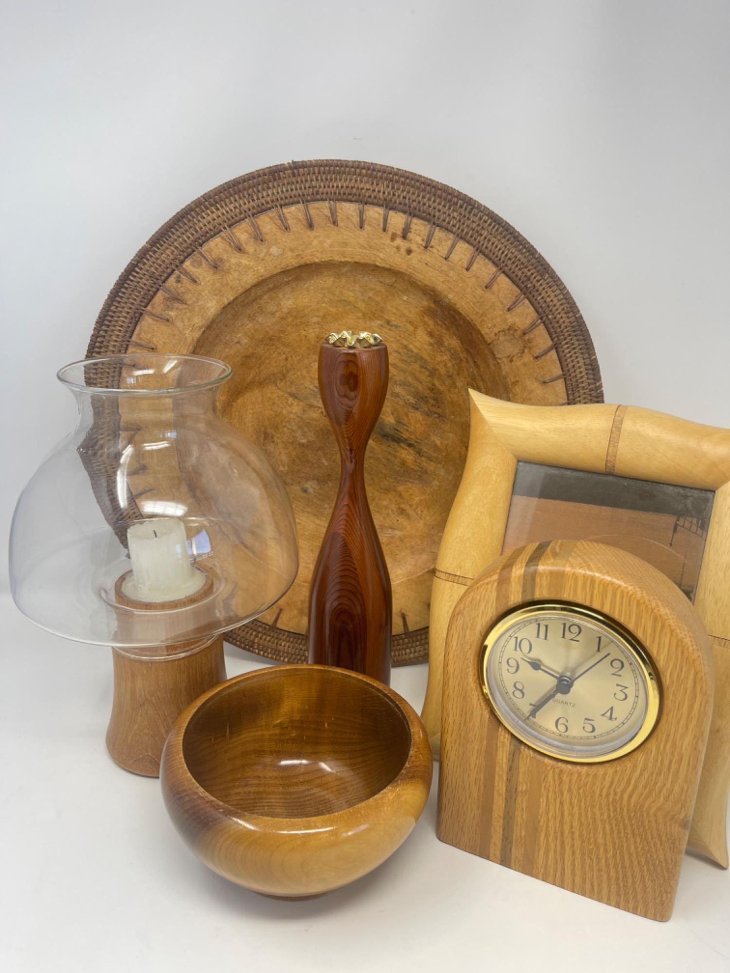 Dolphin Genuine Teakwood Candle Holder From Thailand: 5 inches tall (without glass topper) Fetco International Wood Frame: 8 inches W x 10 inches H Mid Century Tall Candle Holder: 11 inches tall Wooden Clock: 7.75 inches tall Oregon’s Own Myrtlewood Bowl: 6 inches W x 3 inches H Wood and Wicker Bowl/Platter: 15.25 inches wide