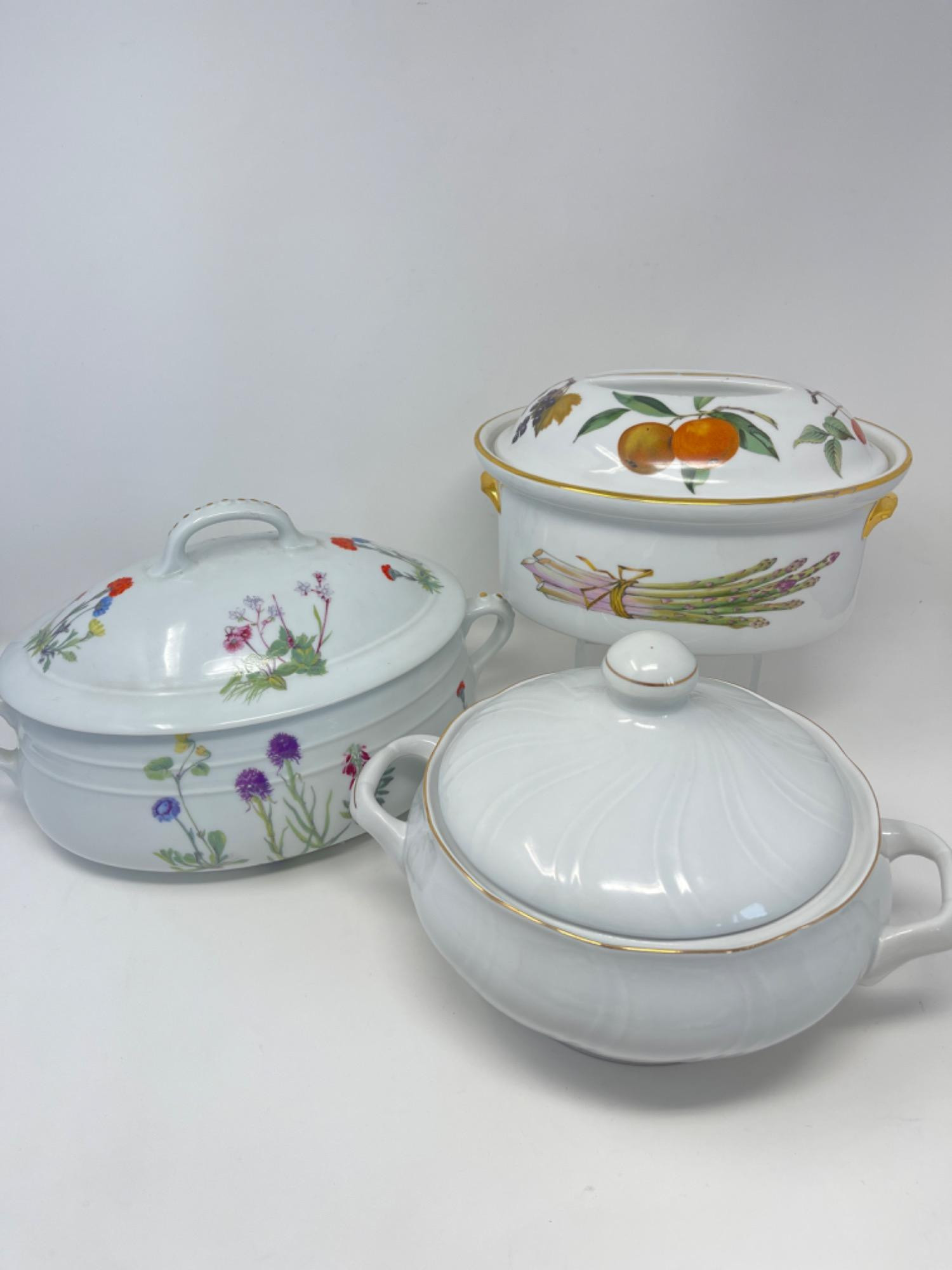 Vintage Royal Worcester Evasham Gold Covered Casserole Dish: 9 inches wide x 4 inches tall Jamestown China Allegro: 10 inches wide x 6 inches tall Louis Lourioux Oval La Faune Covered Casserole Dish Wild Flower France: 13 inches wide x 6 inches tall No large chipping, but there is some minor staining. All need cleaning.