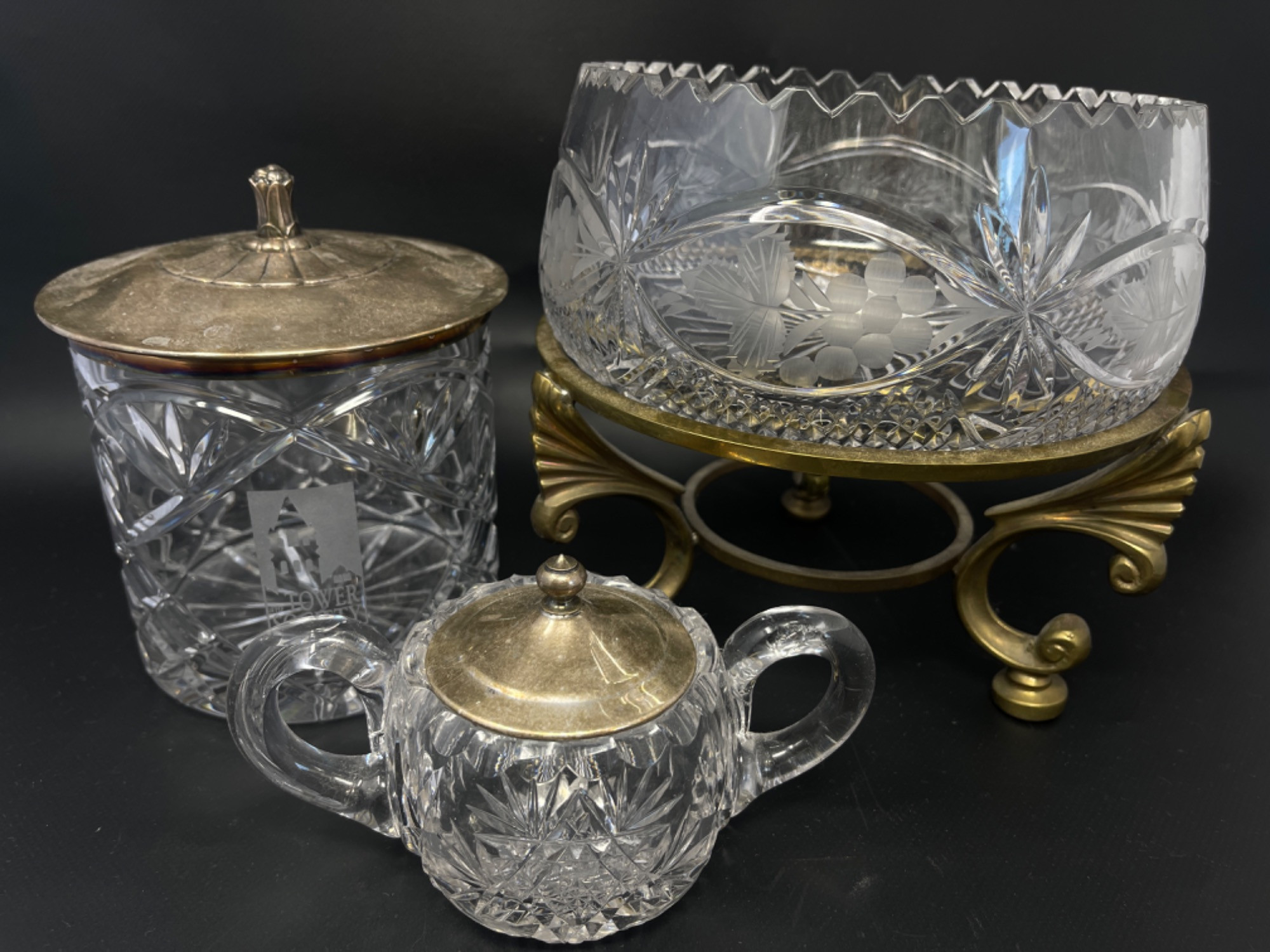 Lot # 190 - Vintage Lead Crystal Assortment - Bowl w/ Stand & (2) Lidded Jars