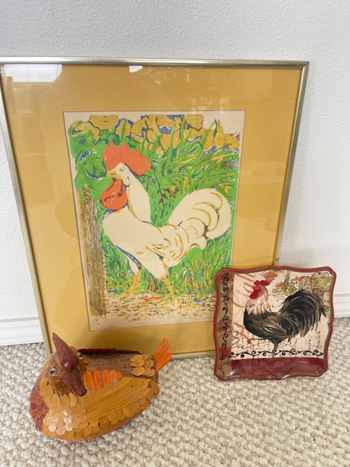 "Early Riser" Signed Print: 16 inches wide x 20 inches tall Vintage Woven Wicker Rooster Basket: 7.5 inches wide x 7 inches tall Certified International Tuscan Rooster Plate: 8.5 inches x 8.5 inches