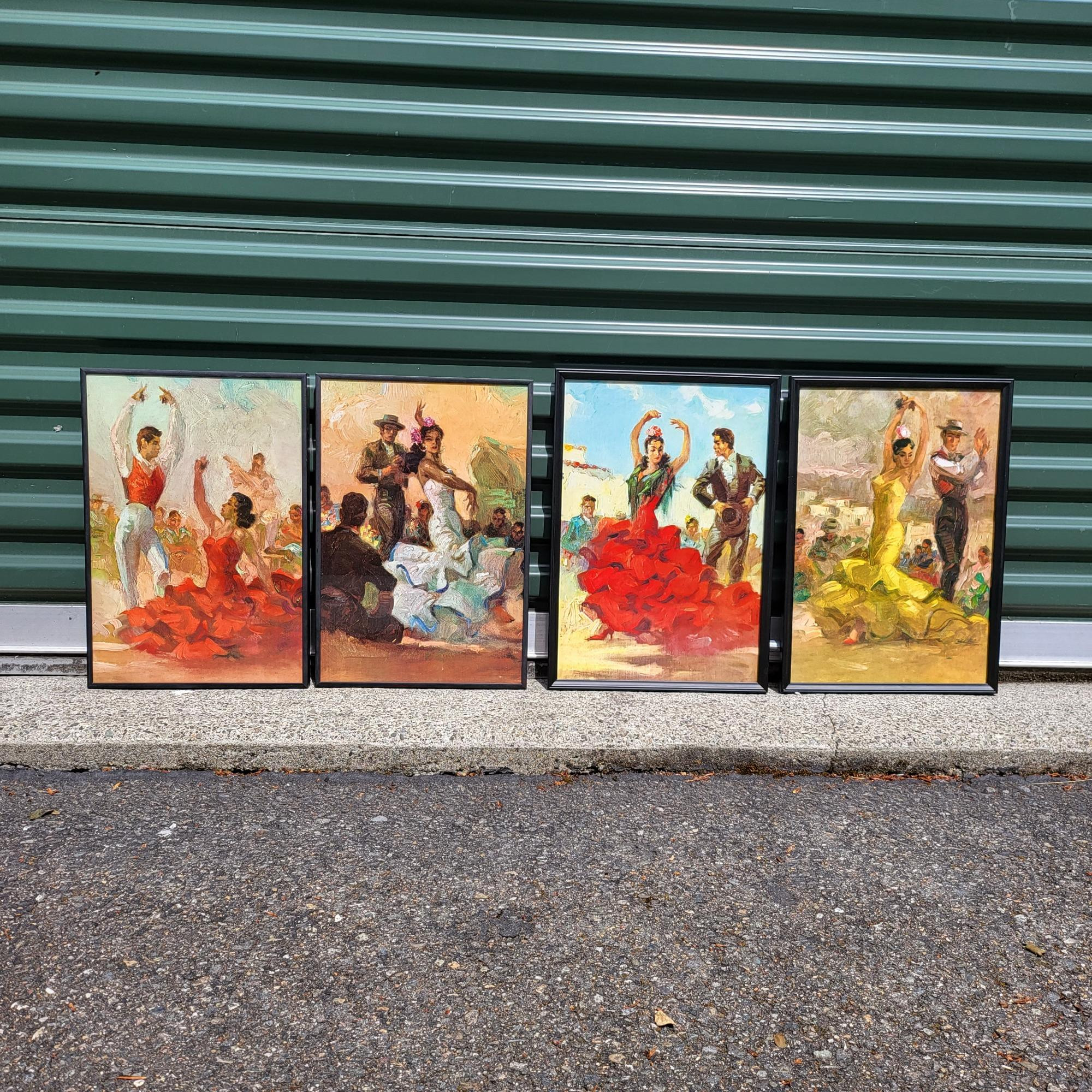 Four, vintage 11" x 16" black framed man & woman, Flamenco Dancers wall art prints. Elegant detail within these beautiful Spanish pictures.